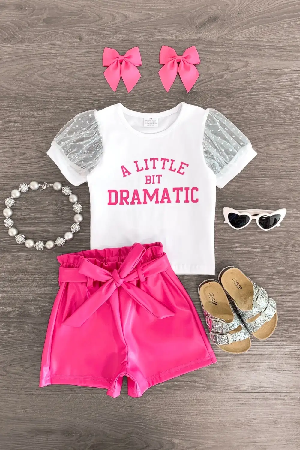 Bring on the warmer weather with this "A Little Bit Dramatic" Pink Pleather Short Set for girls. The white short sleeve top features a fun saying on the front and looks adorable paired with the matching pleather shorts. The stretchy waistband helps comfort and fit and can be great for on the go, while the hot pink adds a fun touch. She can pair this set with or our fun for the perfect look!