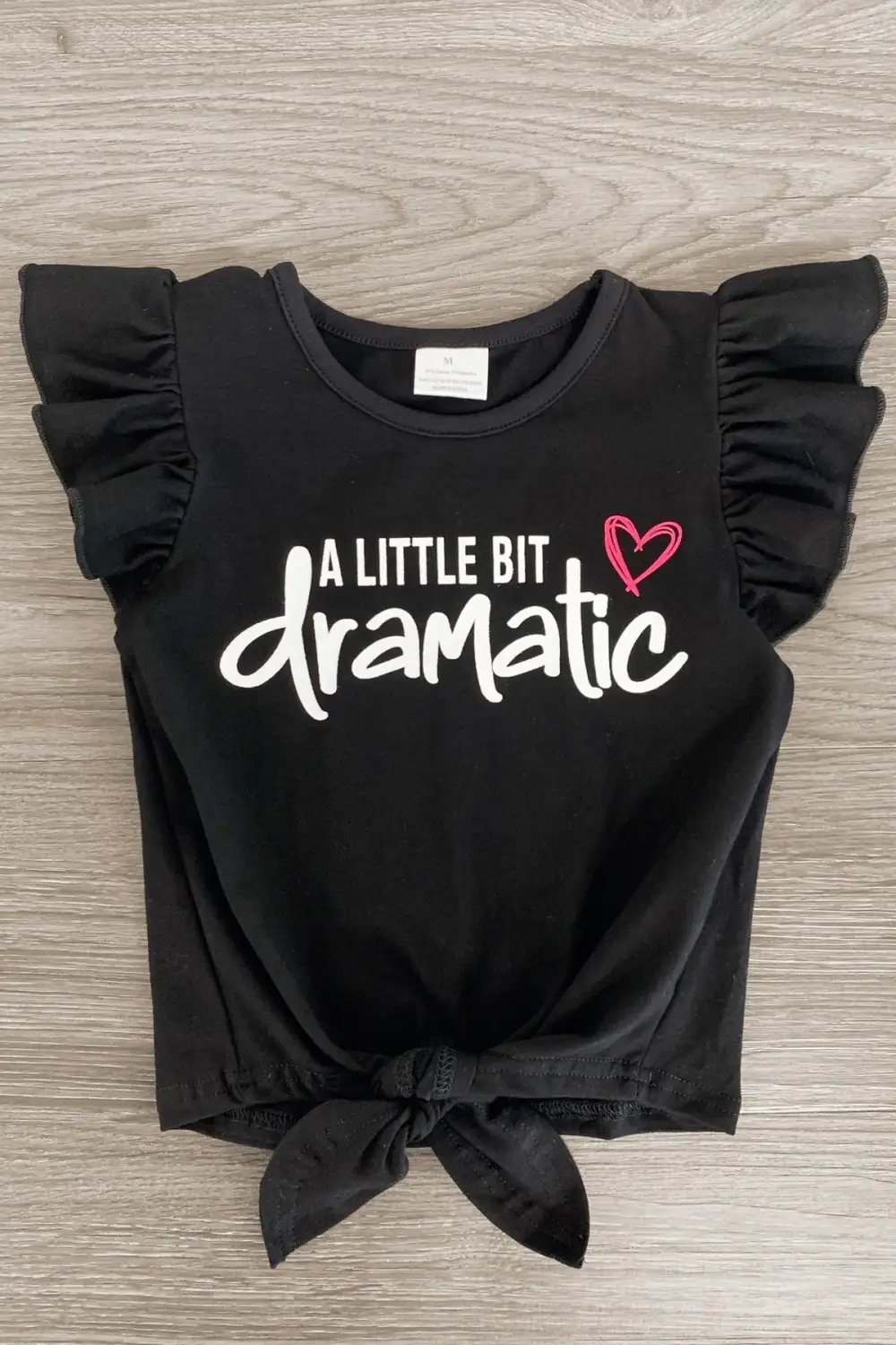 - Tie top features short ruffle sleeves with a fun saying on the front