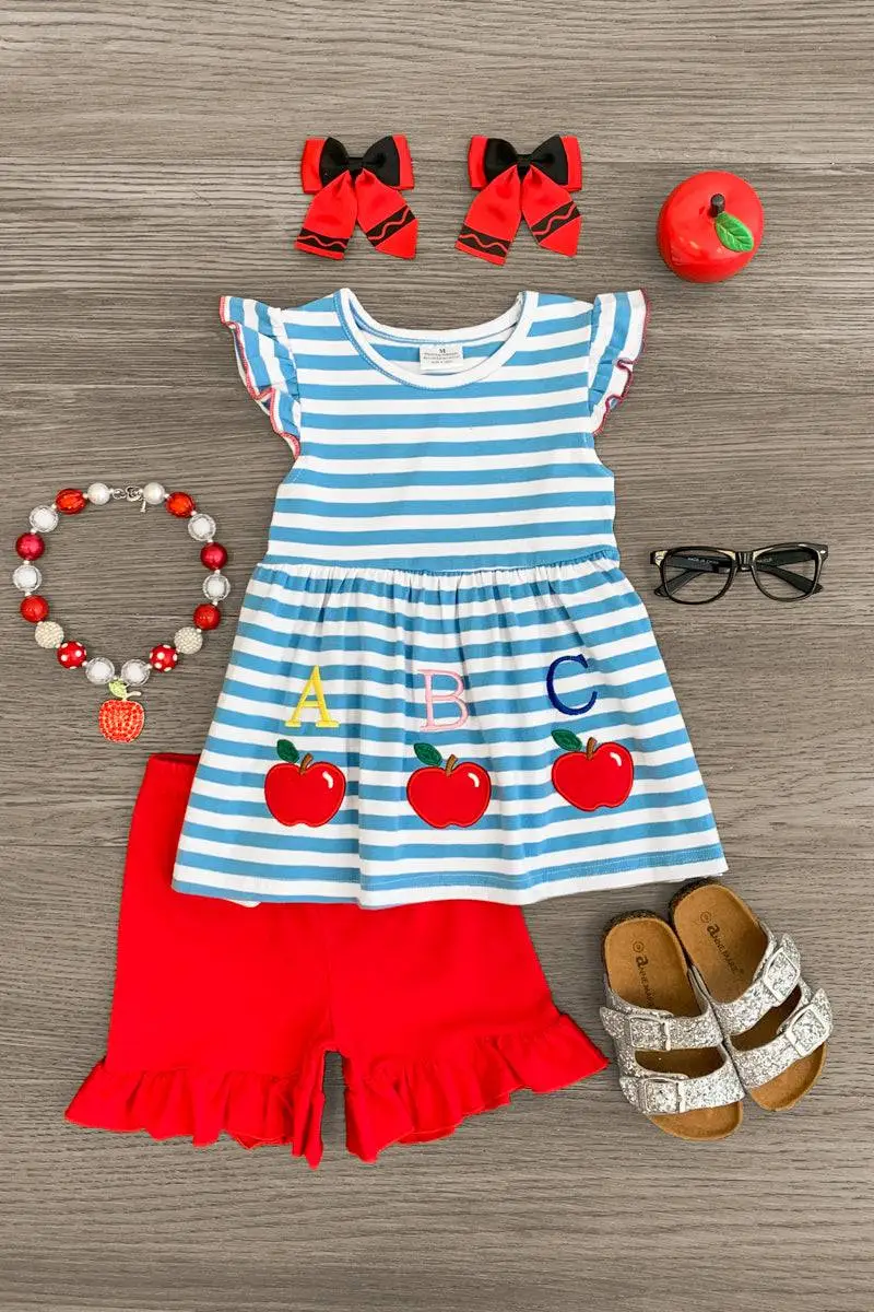 Bring on the warmer weather with this "ABC" Blue Striped Ruffle Short Set for girls. This striped top features a cute flutter sleeves with an "ABC" apple design on the front. This top is paired with matching red ruffle shorts. The stretchy waistband helps comfort and fit and can be great for on the go. The top and shorts can be worn as a set and paired with our matching or keep it laid back with a pair of , she’ll shine bright in this kids ensemble.