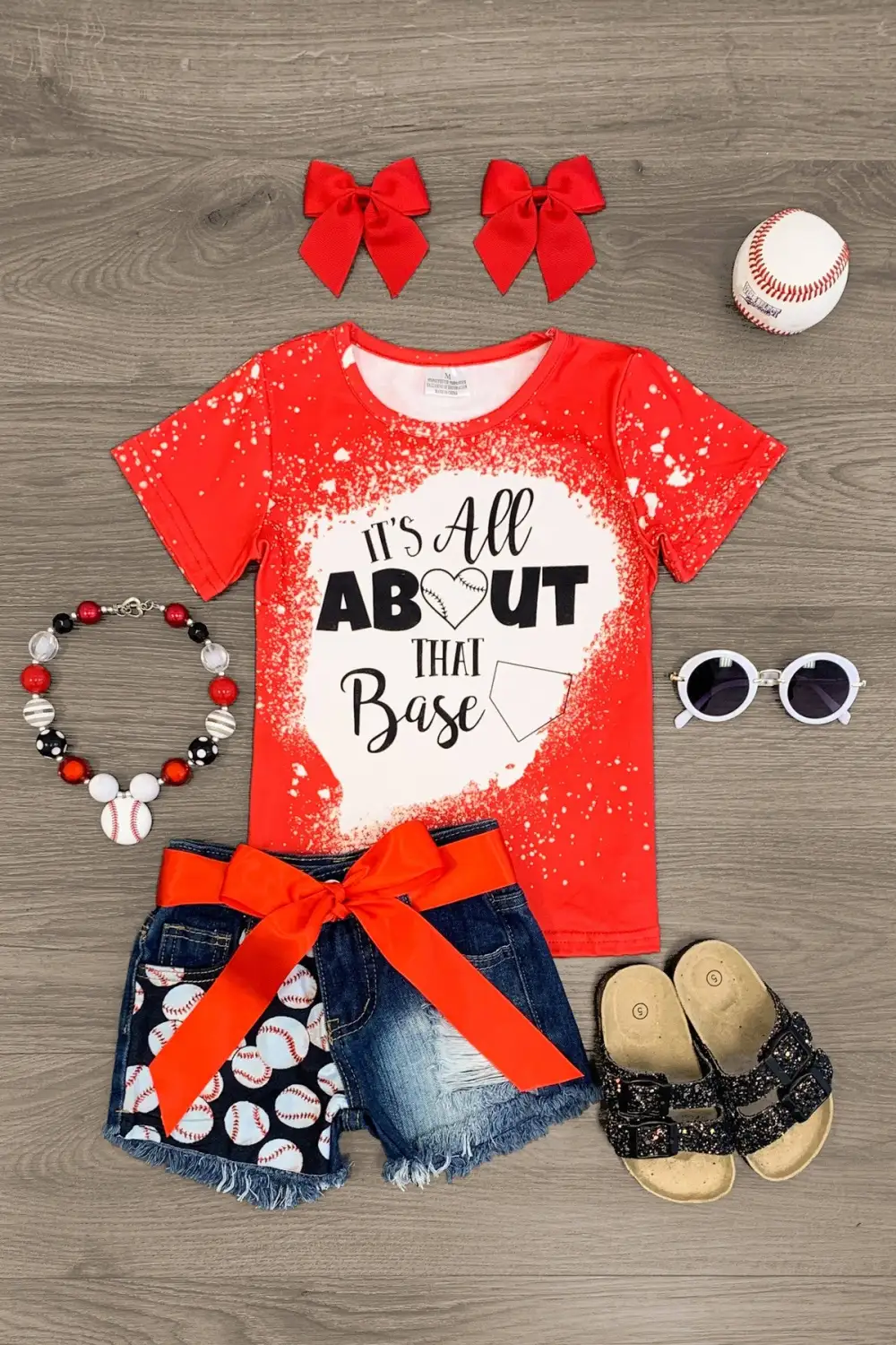 You little one is sure to be the cutest fan at the ballpark in this "All About That Base" Red Denim Short Set for girls. This red short sleeve top looks adorable paired with the distressed denim shorts. The adjustable waistband and belt helps with comfort and fit and can be great for on the go. The top and shorts can be worn as a set and paired with our SIP or keep it laid back with a pair of , she’ll shine bright in this kids ensemble.