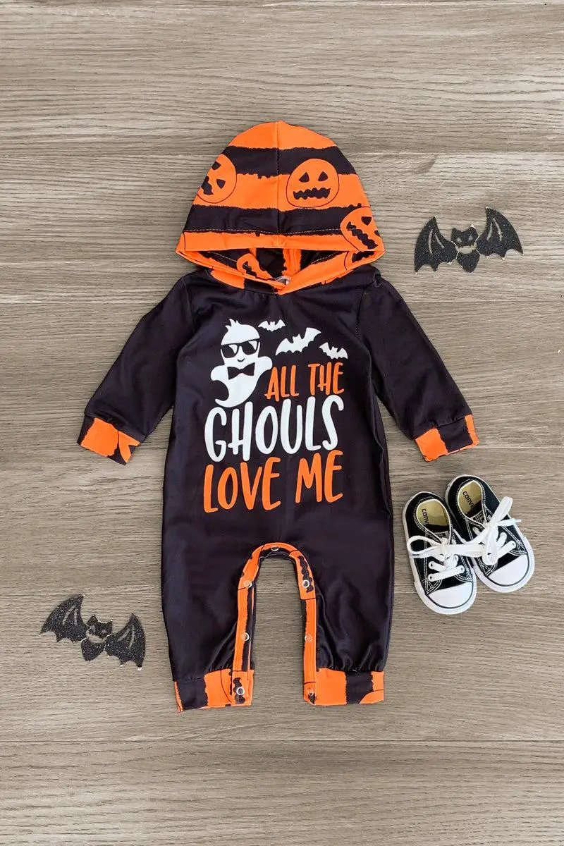 Dress up your spooky little one for the day in this "All The Ghouls Love Me" Hoodie Romper. This long sleeve romper for infants is made from soft & stretchy fabric, making it a comfortable one-piece for cool weather wear. It features a black design with spooky orange accents & a fun saying on the front. The snap fastenings on the crotch allow for easy dressing and changing. Check out our baby collection for more items like this one!