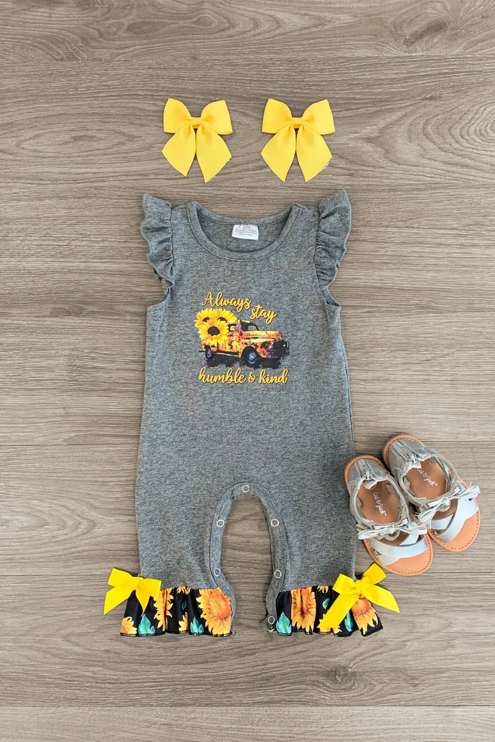 Dress up your little girl for sunny days in this "Always Stay Humble & Kind" Gray Romper for infants. This ruffle sleeve romper is made from soft & stretchy fabric, making it a comfortable one-piece for warm-weather wear. It features heather gray design with sunflower ruffle details. The snap fastenings on the crotch allow for easy dressing and changing. Pair this onesie with a couple SIP for the perfect warm weather look.