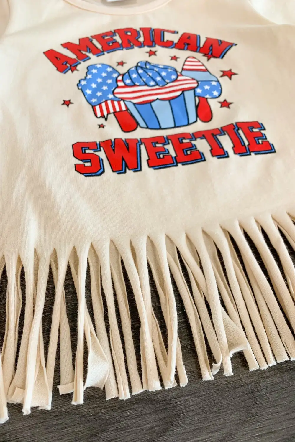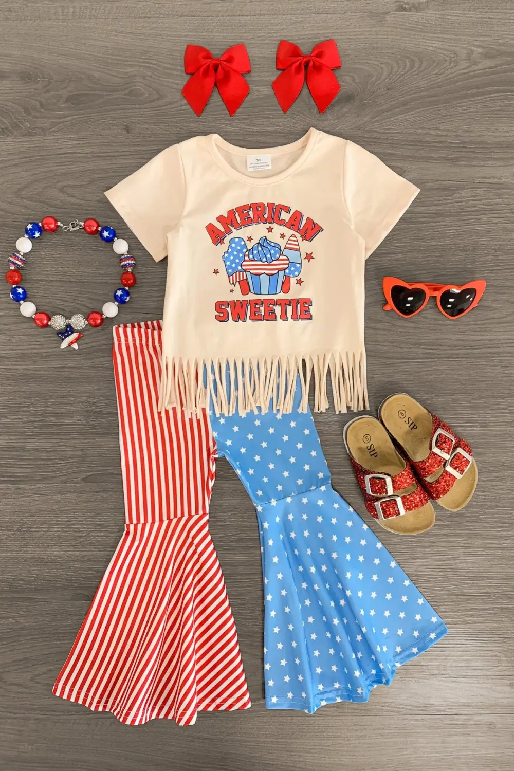 Bring on the warmer weather with this "American Sweetie" Bell Bottom Set for girls. The cream short sleeve top features fringe detailing with a sweet design embossed on the front and looks adorable paired with the matching bell bottoms. The stretchy waistband helps comfort and fit and can be great for on the go, while the stars and stripes add a fun touch. This set can be paired with our sequin and a pair of for the perfect patriotic look!