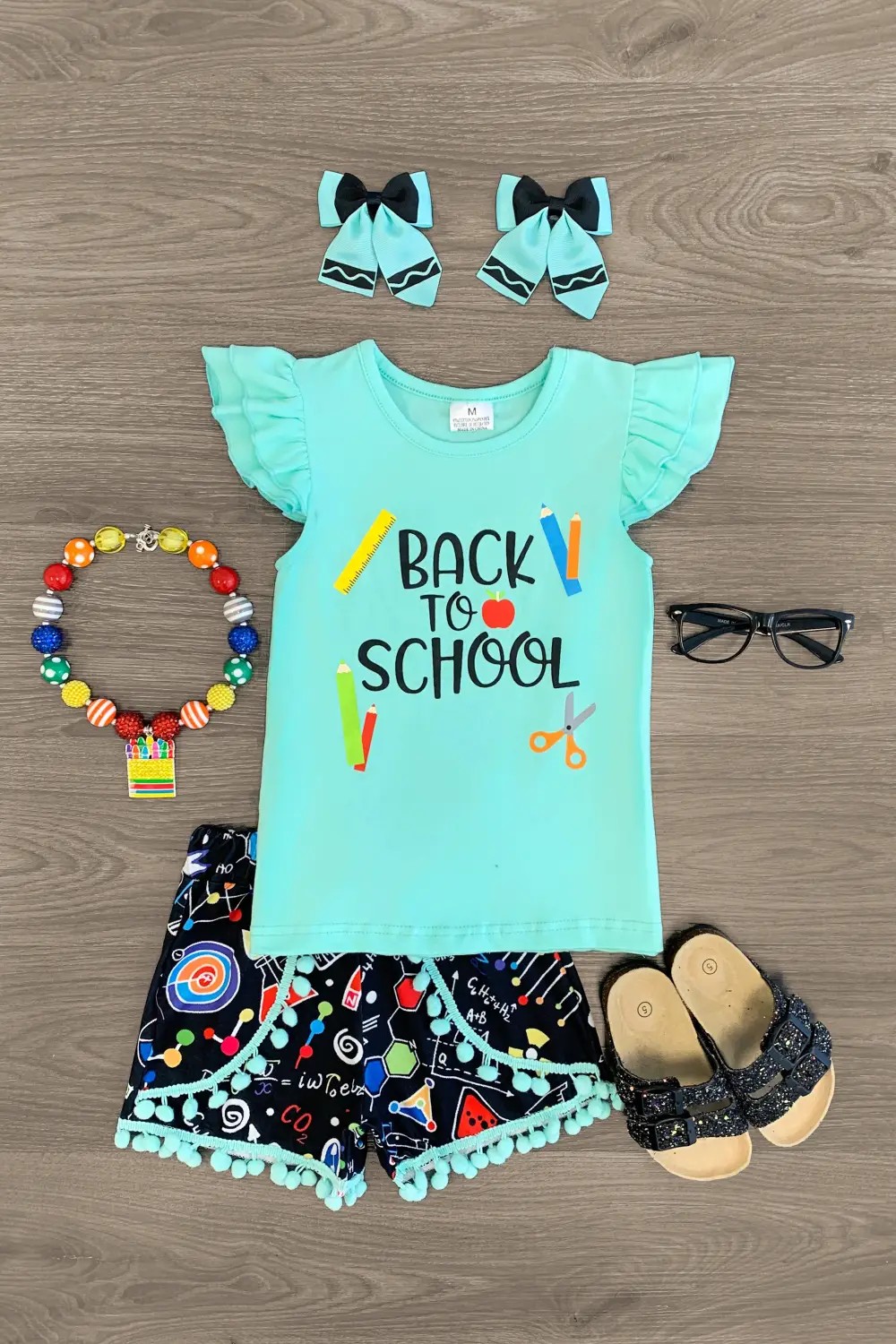 Add sweet fluttery style to her look with this "Back To School" Mint Short Set. This girls' set is styled with a mint top making it a staple addition to her everyday wear. The top is paired with matching school print pom pom shorts creating an easy back to school look. The stretchy waistband provides a secure fit and all day comfort. She can pair this set with or our fun SIP for the perfect look!