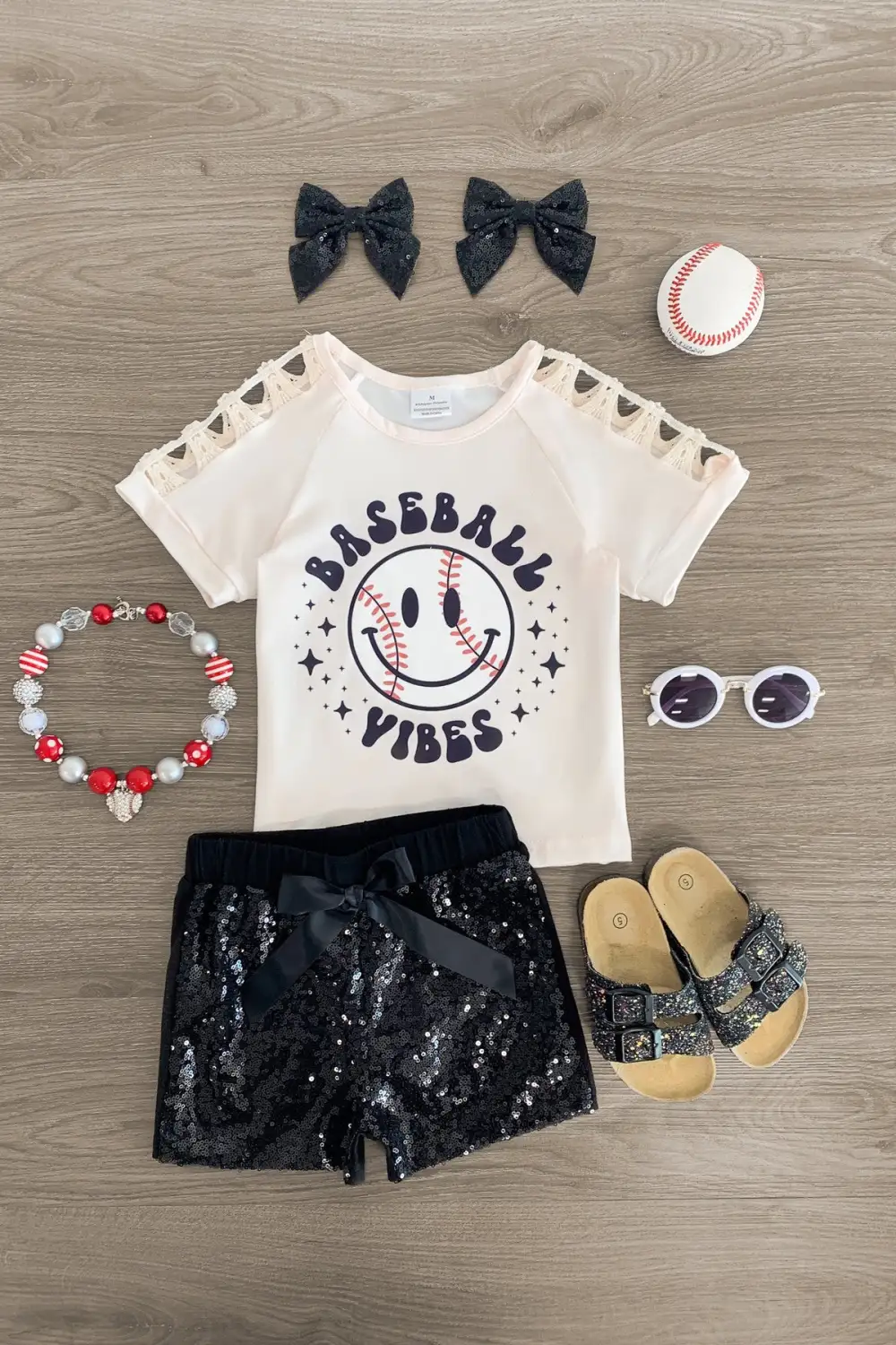 Bring on the warmer weather with our "Baseball Vibes" Smiley Sequin Short Set for girls. The cream crochet sleeve top features a fun design on the front and looks adorable paired with the matching shorts. The stretchy waist helps comfort and fit and can be great for on the go, while the black sequins add a fun touch. She can pair this set with or a matching for the perfect look!