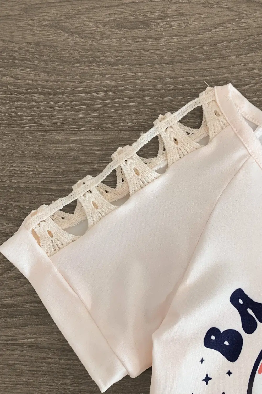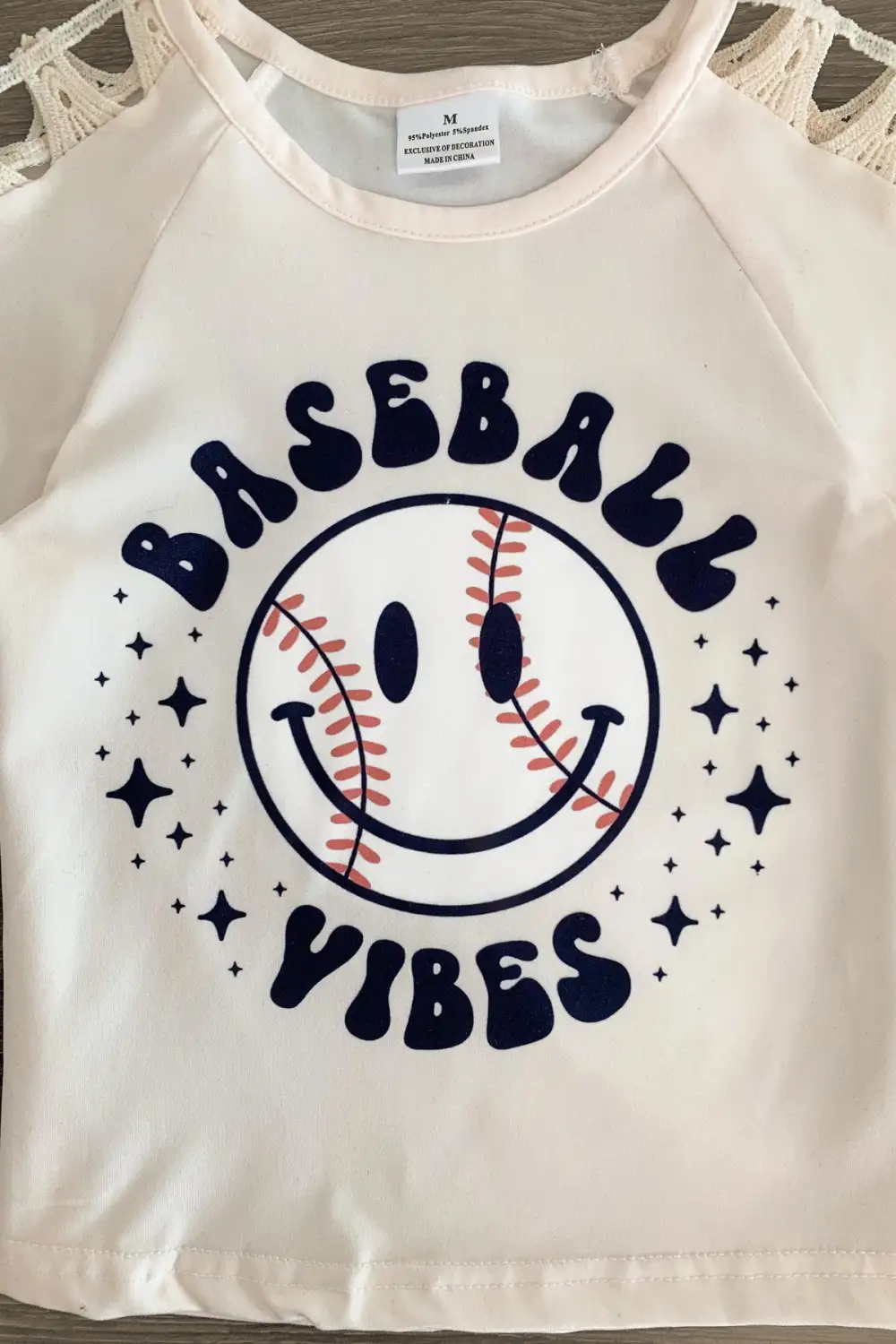 - Top features crochet sleeves & a smiley baseball on the front