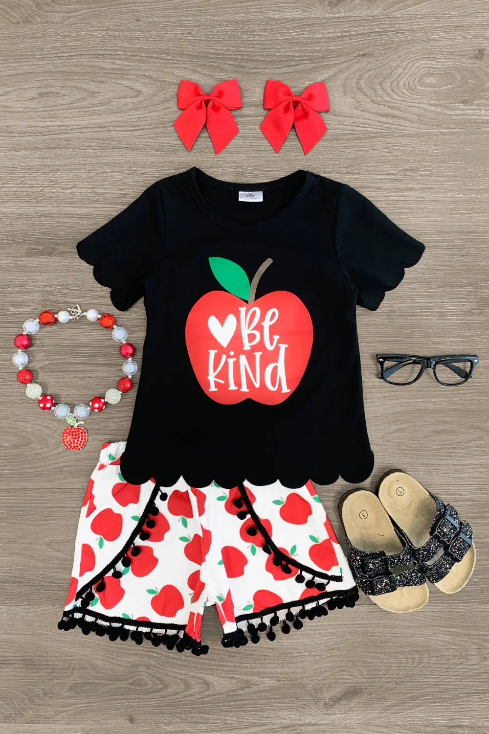 Add sweet crafty style to her look with this "Be Kind" Apple Pom Pom Short Set. This girls' set is styled with a black top a scalloped hem, making it a staple addition to her everyday wear. The top is paired with matching apple print shorts with pom-pom details creating an easy back to school look. The stretchy waistband provides a secure fit and all day comfort. She can pair this set with or our fun SIP for the perfect look!