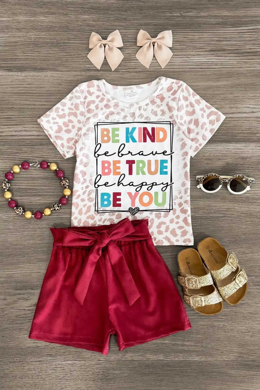 Add sweet fluttery style to her look with this "Be Kind, Be True..." Suede Short Set. The cheetah print top features a sweet saying on the front and looks adorable paired with the matching burgundy shorts. The stretchy waistband helps comfort and fit and can be great for on the go, while the suede adds a nice touch. She can pair this set with or a matching for the perfect look!