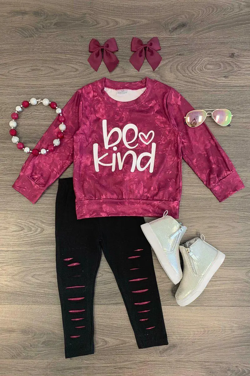 Add sweet fluttery style to her look with this "Be Kind" Burgundy Distressed Legging Set. This girls' set is styled with a sweet burgundy long sleeve top making it a staple addition to her everyday wear. The top is paired with matching peekaboo print distressed leggings. The stretch waistband provides a secure fit and allows for all day comfort. She can pair this set with or our fun for the perfect look!