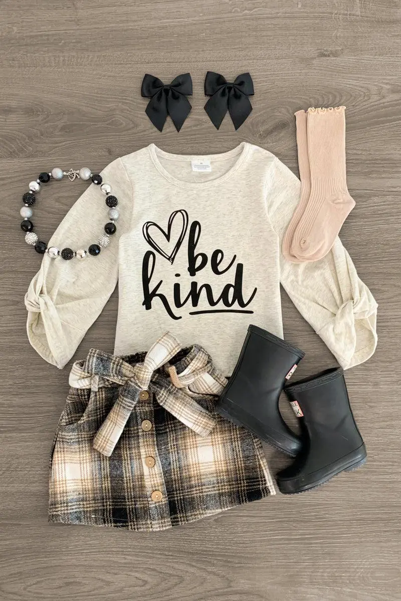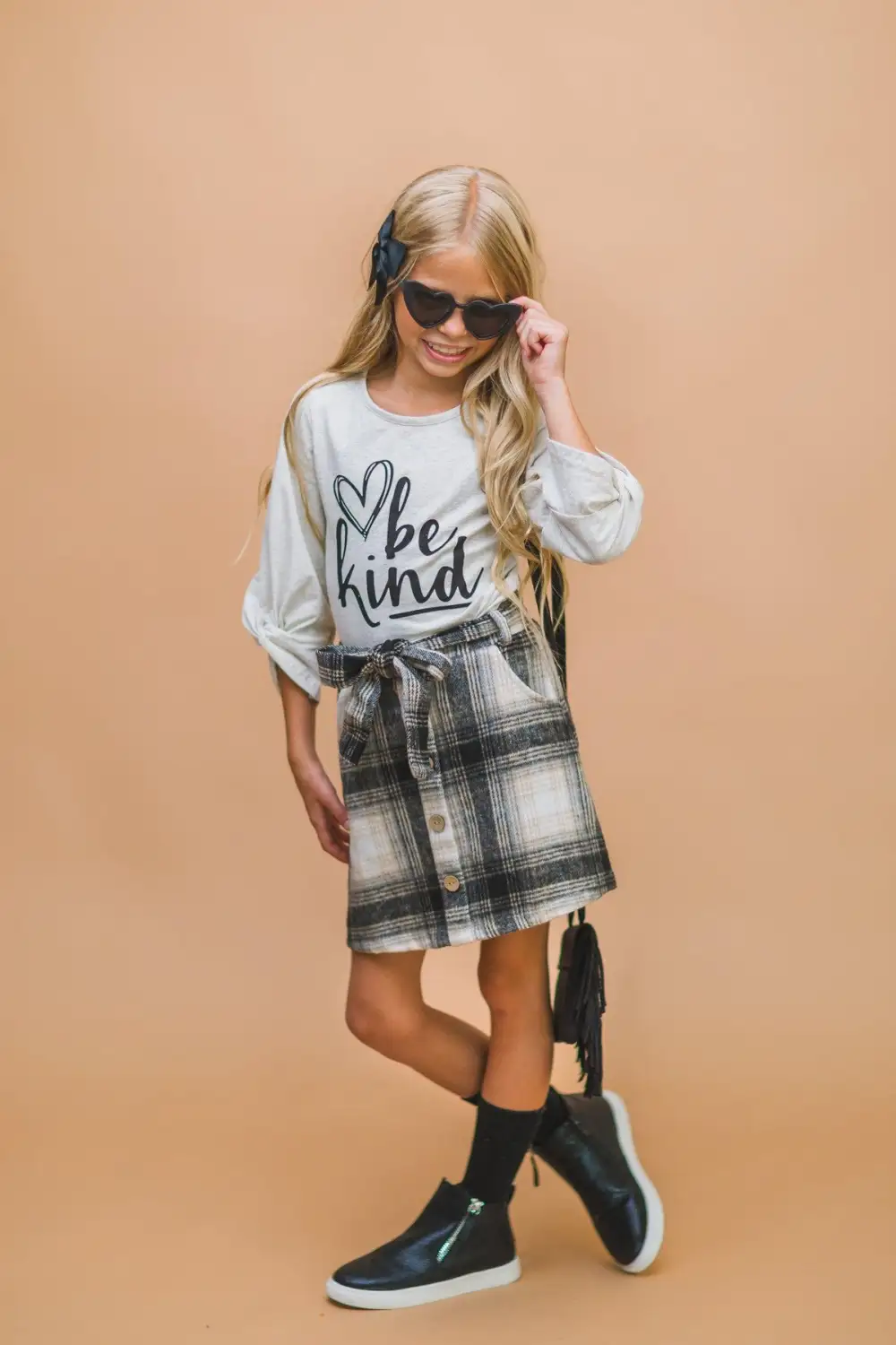 Your sweet little one will look oh-so adorable in our "Be Kind" Cream & Plaid Skirt Set for girls. This set features a heather cream long sleeve top, making it perfect for Fall. This long sleeve top looks adorable paired with the matching plaid skirt. The stretchy waistband & tie belt helps comfort and fit and can be great for on the go. The top and skirt can be worn as a set and paired with our SIP or keep it laid back with a pair of , she’ll shine bright in this kids ensemble.