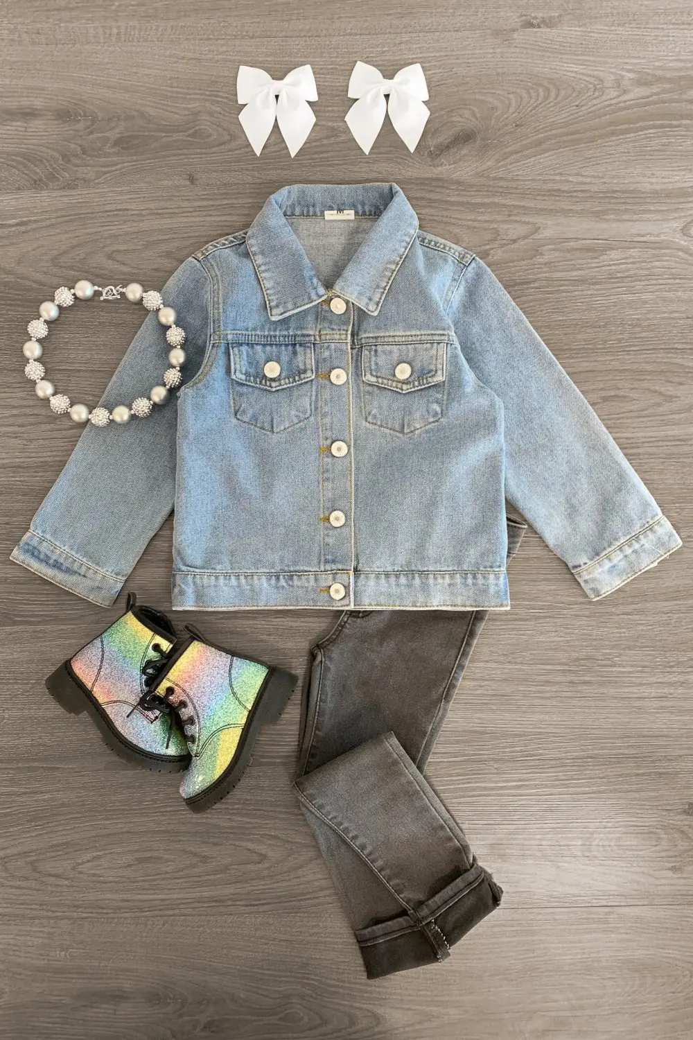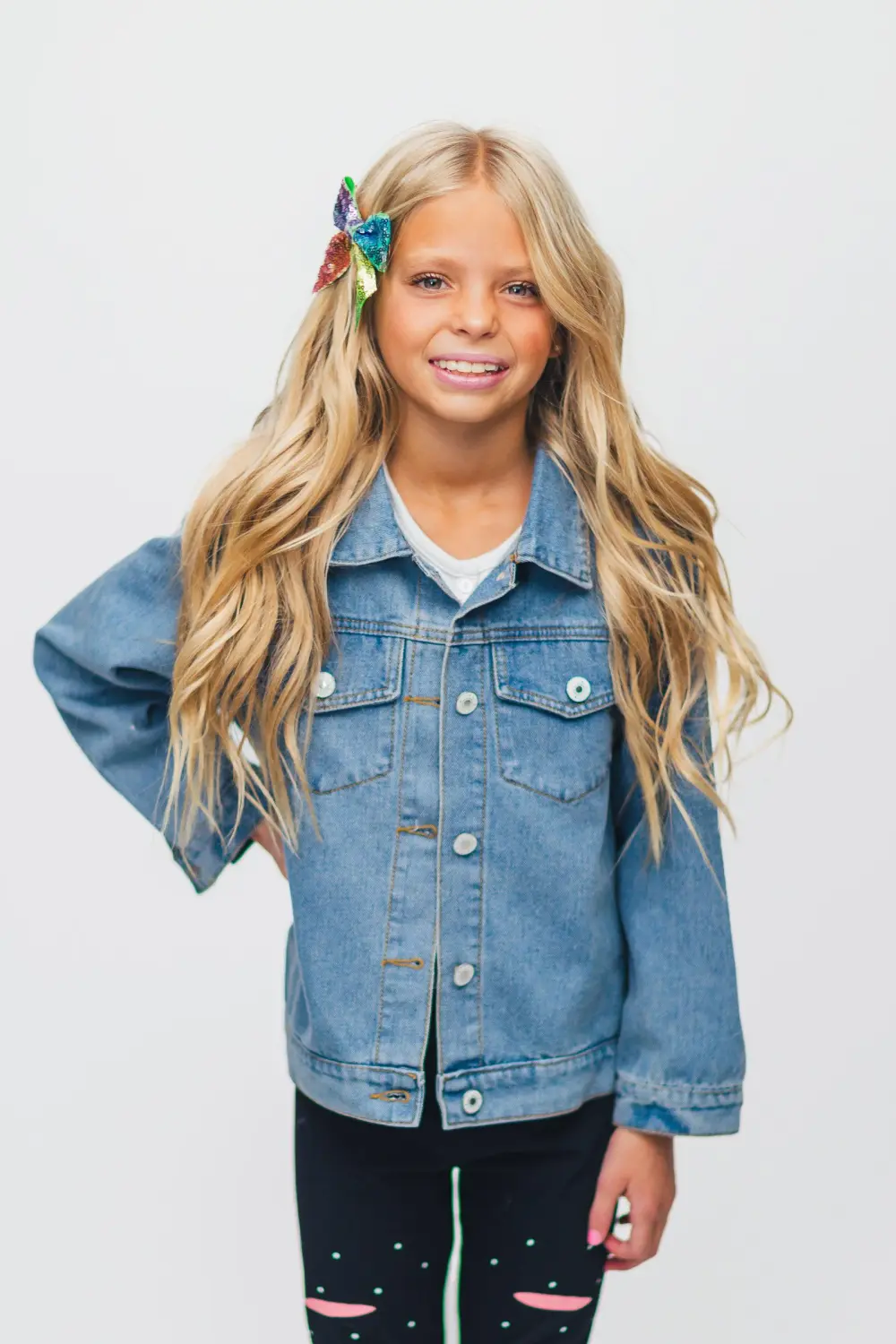 Your gal will love the comfort and cool style this "Be Kind" Denim Jacket brings to her cool weather wardrobe. Made from soft & breathable fabric, this girls' jacket feels soft against her skin, while the long sleeves offer her a cozy fit. Pair this jacket with our matching or for the perfect look!