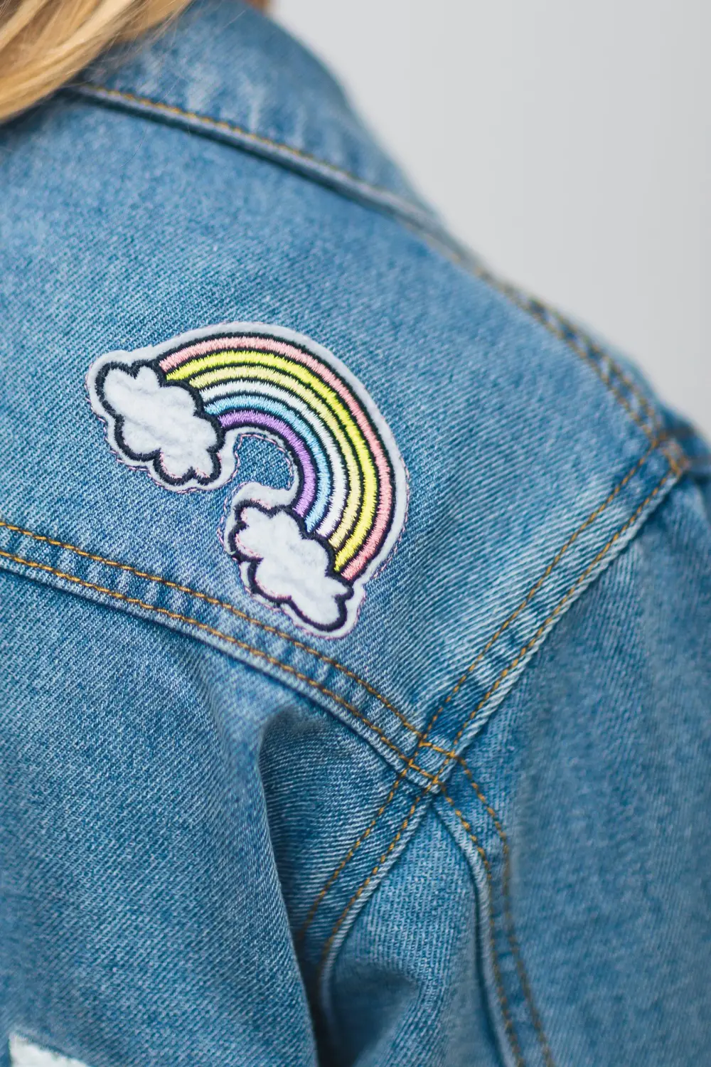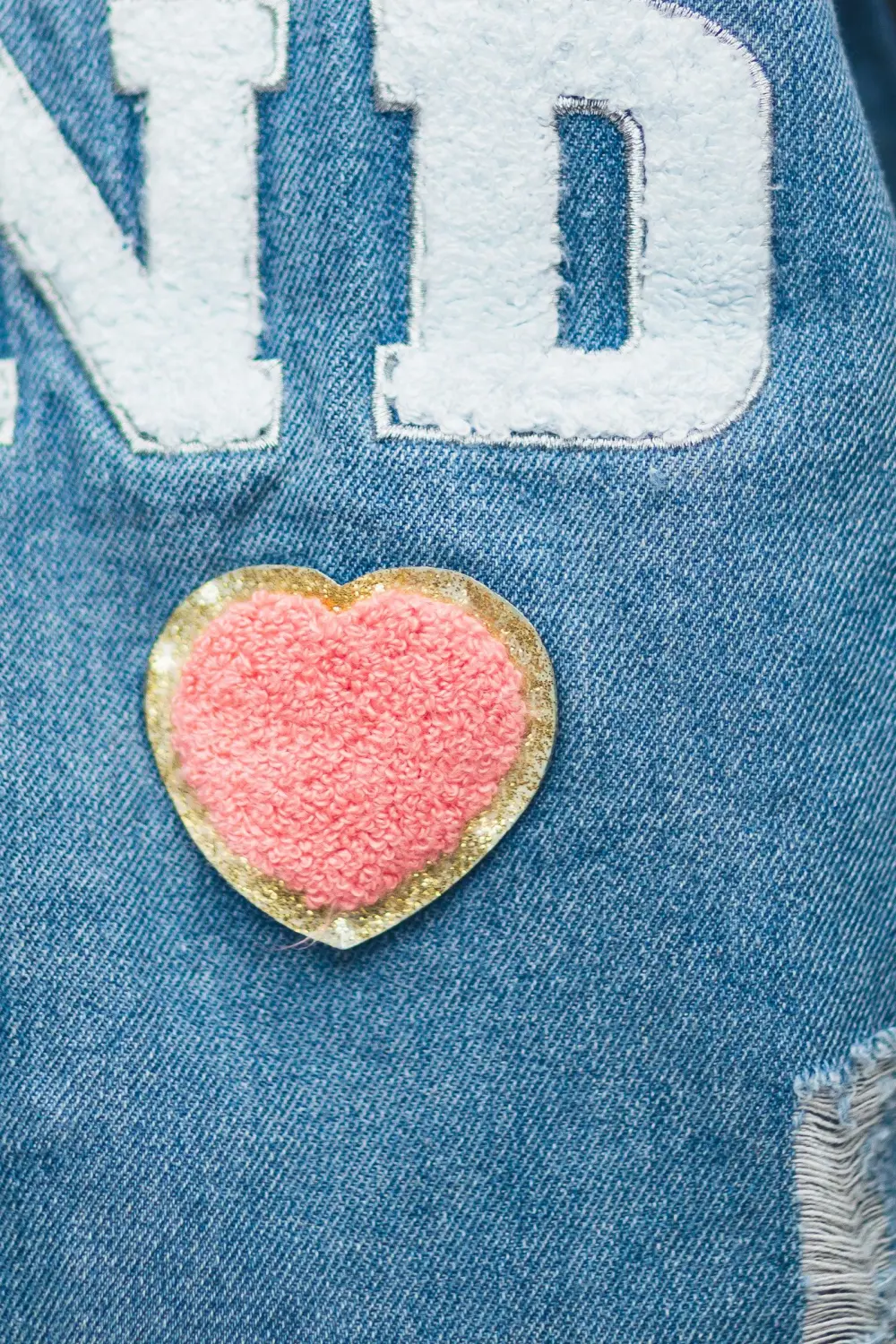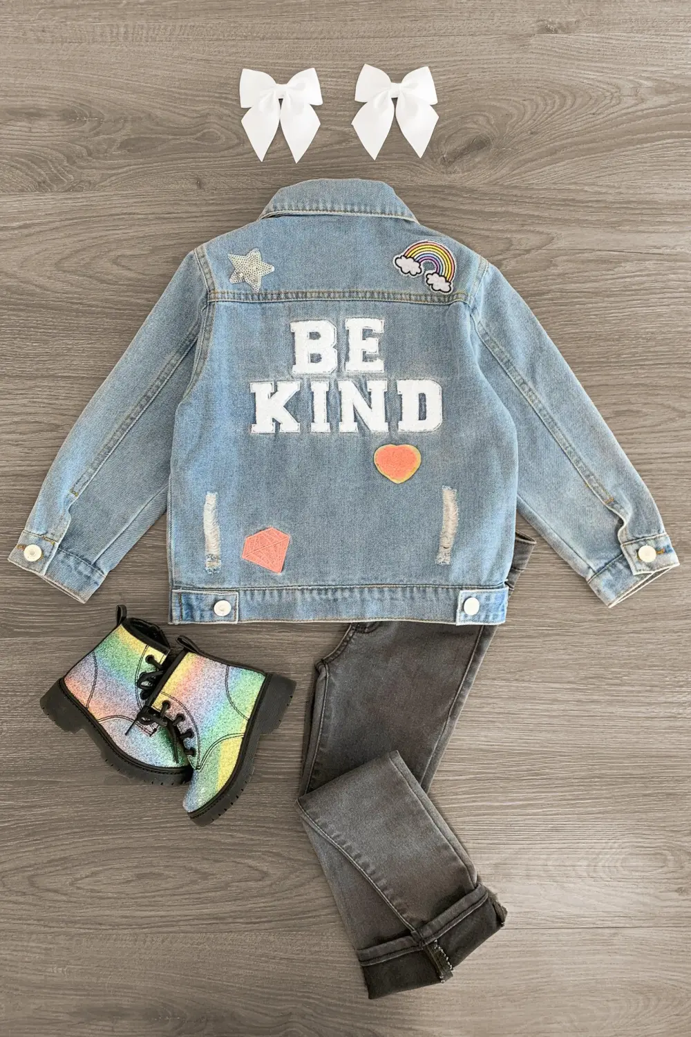 - Denim jacket features "Be Kind" with adorable patches on the back