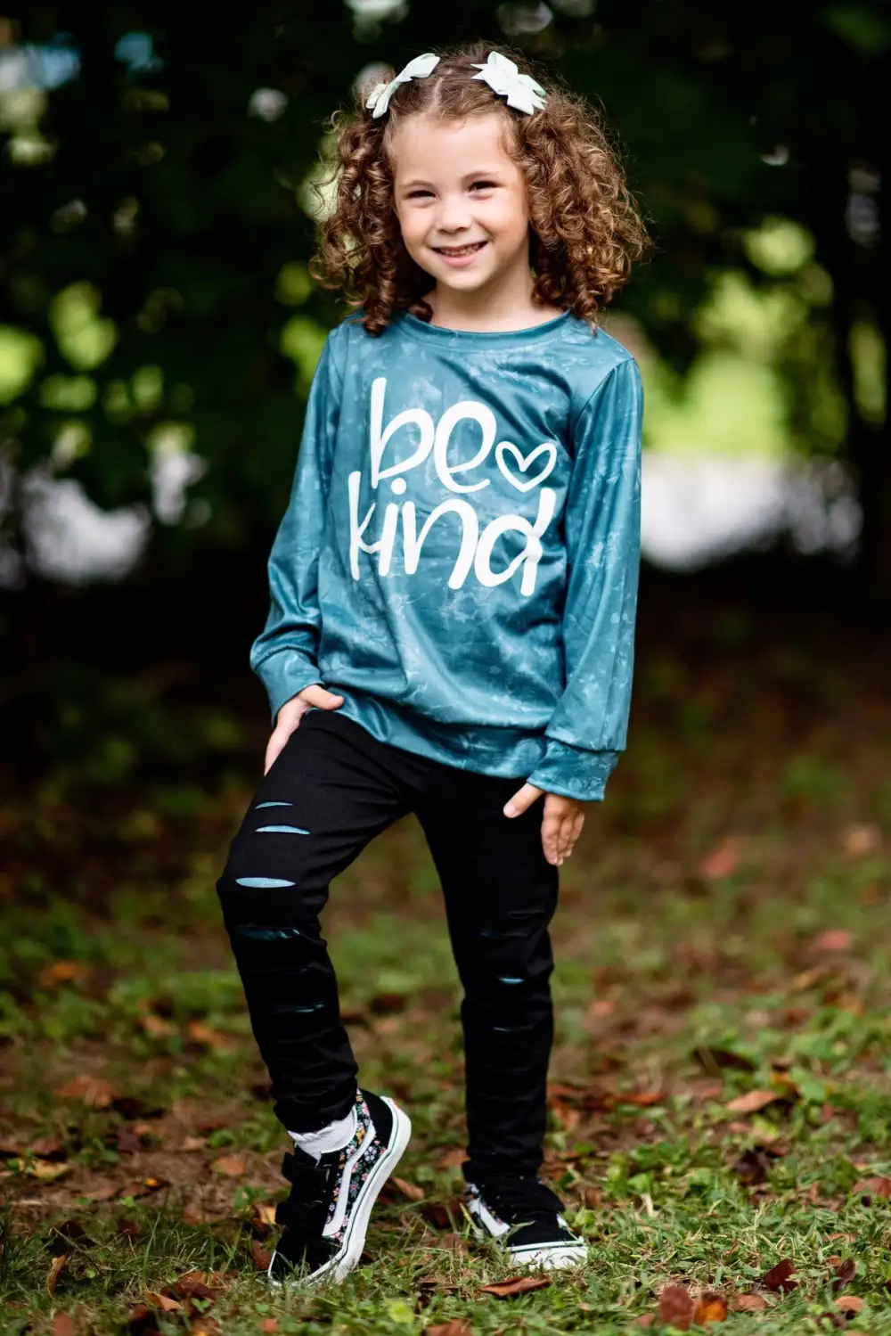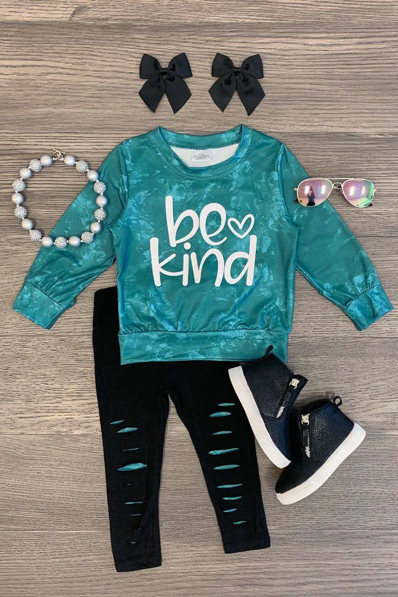 Add sweet fluttery style to her look with this "Be Kind" Green Distressed Legging Set. This girls' set is styled with a sweet green tie dye print long sleeve top making it a staple addition to her everyday wear. The top is paired with matching peekaboo print distressed leggings. The stretch waistband provides a secure fit and allows for all day comfort. She can pair this set with or our fun for the perfect look!