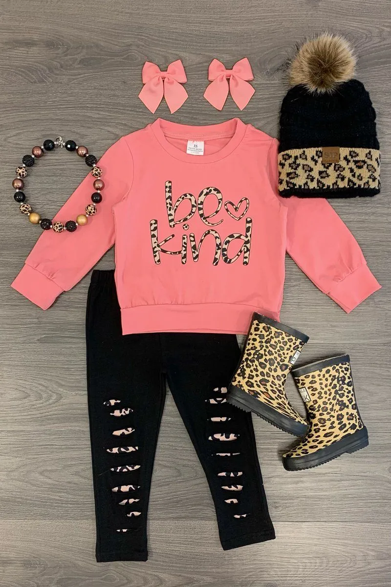 Add sweet fluttery style to her look with this "Be Kind" Pink Leopard Distressed Legging Set. This girls' set is styled with a sweet pink long sleeve top making it a staple addition to her everyday wear. The top is paired with matching peekaboo print distressed leggings. The stretch waistband provides a secure fit and allows for all day comfort. She can pair this set with or our fun for the perfect look!