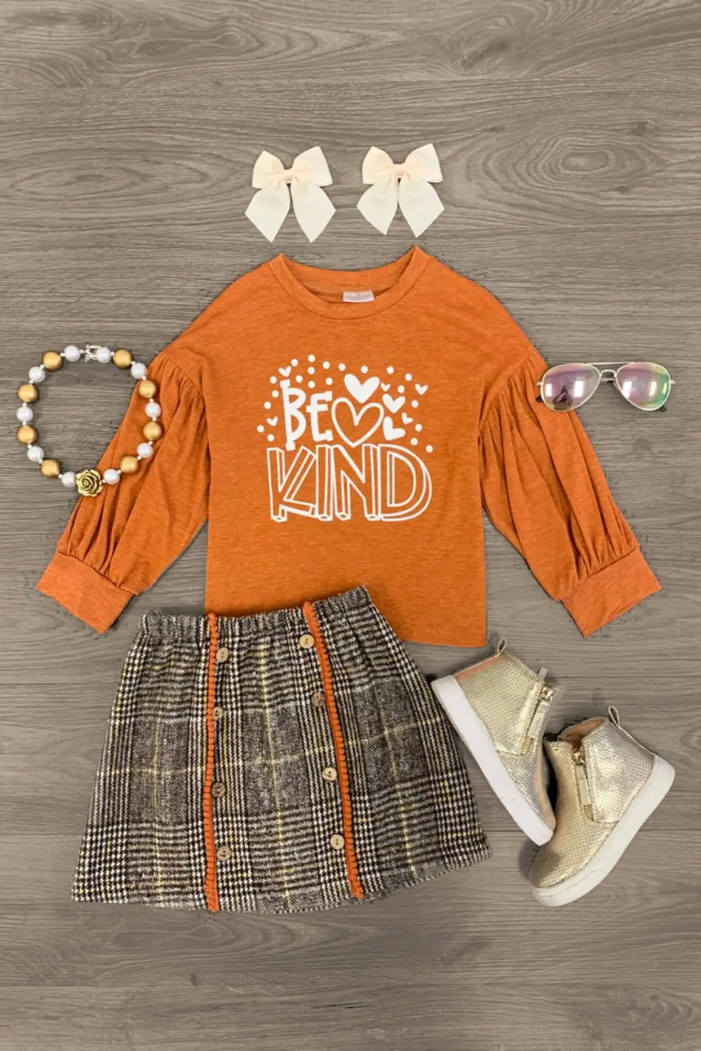 Your sweet little one will look oh-so adorable in our "Be Kind" Plaid Skirt Set for girls. This set features a burnt orange long sleeve top making it perfect for Fall. This long sleeve top looks adorable paired with the matching plaid skirt. The stretchy waistband helps comfort and fit and can be great for on the go. The top and skirt can be worn as a set and paired with our SIP or keep it laid back with a pair of , she’ll shine bright in this kids ensemble.