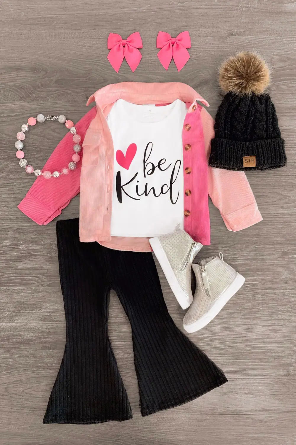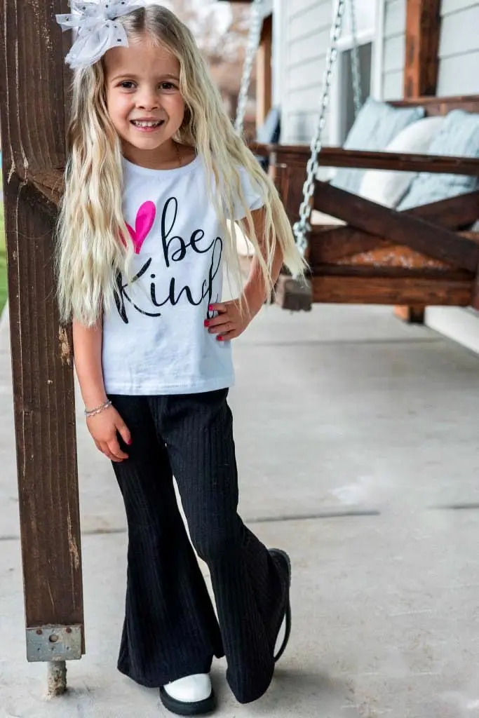 Bring on the cooler weather with this "Be Kind" Ribbed Bell Bottom Set for girls. The short sleeve top features a sweet heart design on the front and looks adorable paired with the black ribbed bell bottoms. The stretchy waistband helps comfort and fit and can be great for on the go. The set can be paired with our and a pair of for the perfect look!