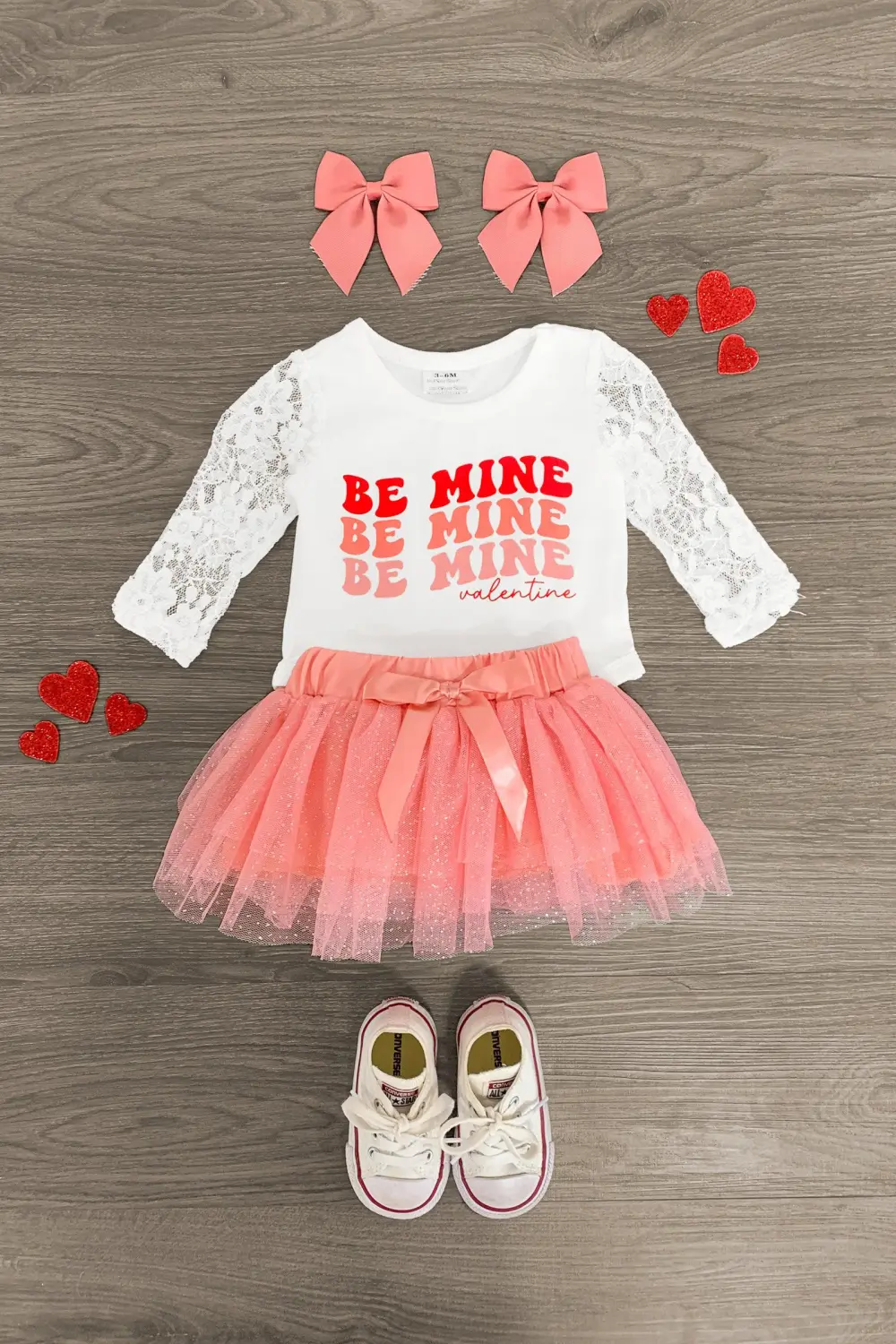 Dress up your little one for the day in this "Be Mine Valentine" Tutu Onesie Set. This set features a white onesie style long sleeve top, and is paired with a matching pink tutu skirt. Mix and match these two pieces to create the perfect look! Check out our for more sets like this one!