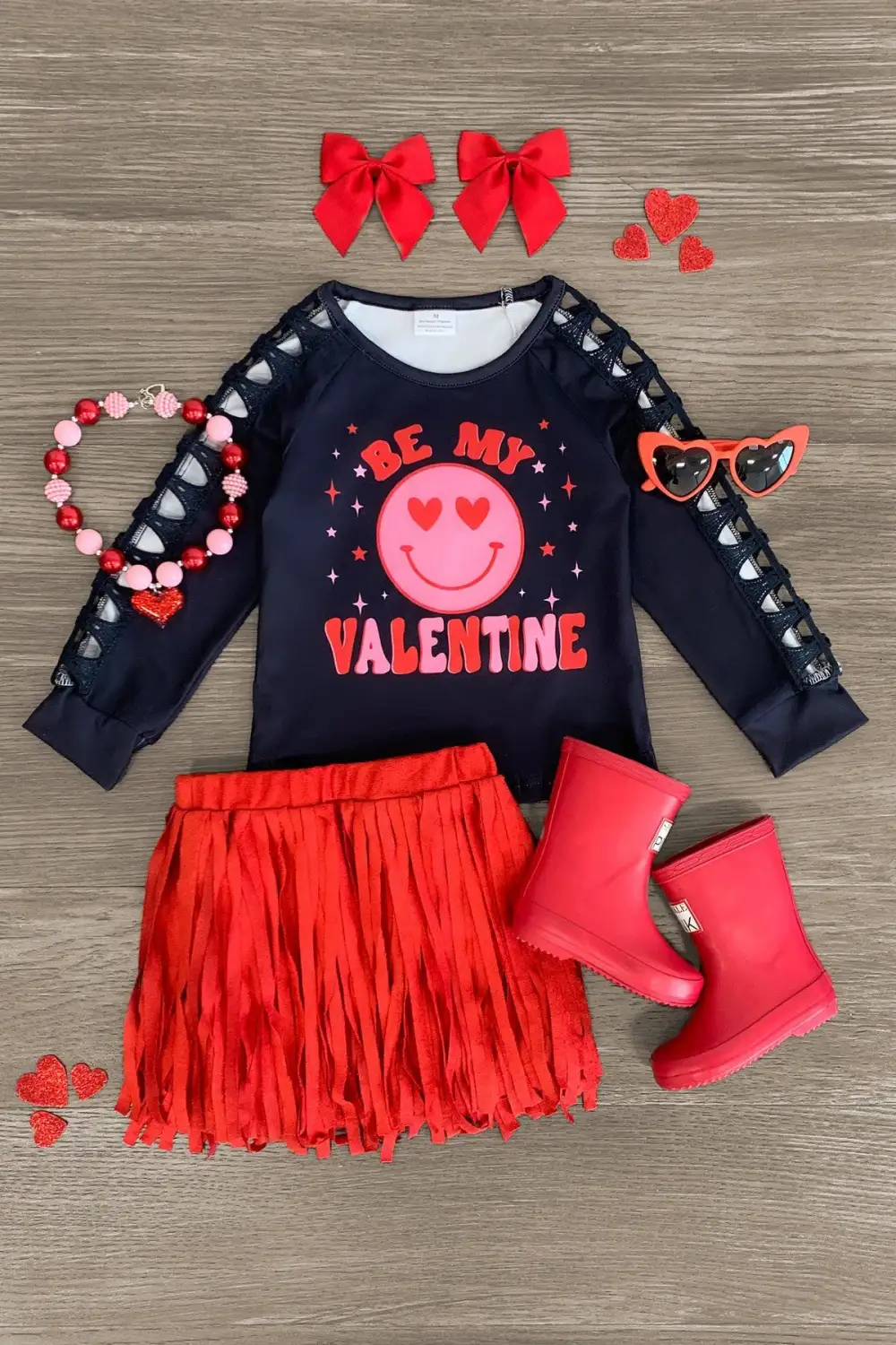 Your little one will look so cute in our "Be My Valentine" Red Fringe Skirt Set for girls. The long sleeve top looks adorable paired with the matching red skirt. The stretchy waistband helps comfort and fit and can be great for on the go, while the fringe adds an edgy touch to her look. The top and skirt can be worn as a set and paired with our SIP or keep it laid back with a pair of , she’ll shine bright in this kids ensemble.