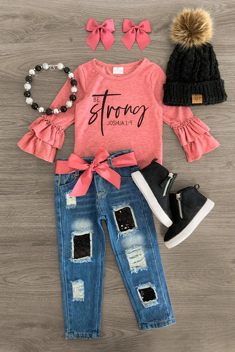 Bring on the positive vibes with this "Be Strong" Pink Sequin Denim Pant Set for girls. This long sleeve top features a cute saying embossed on the front. This pink top looks adorable paired with the matching denim jeans. The adjustable waistband & ribbon belt helps comfort and fit and can be great for on the go. The top and pants can be worn as a set and paired with our SIP or keep it laid back with a pair of , she’ll shine bright in this kids ensemble.