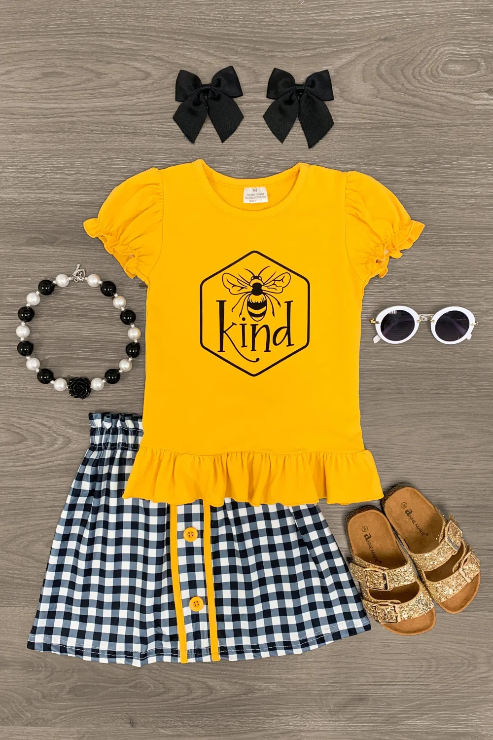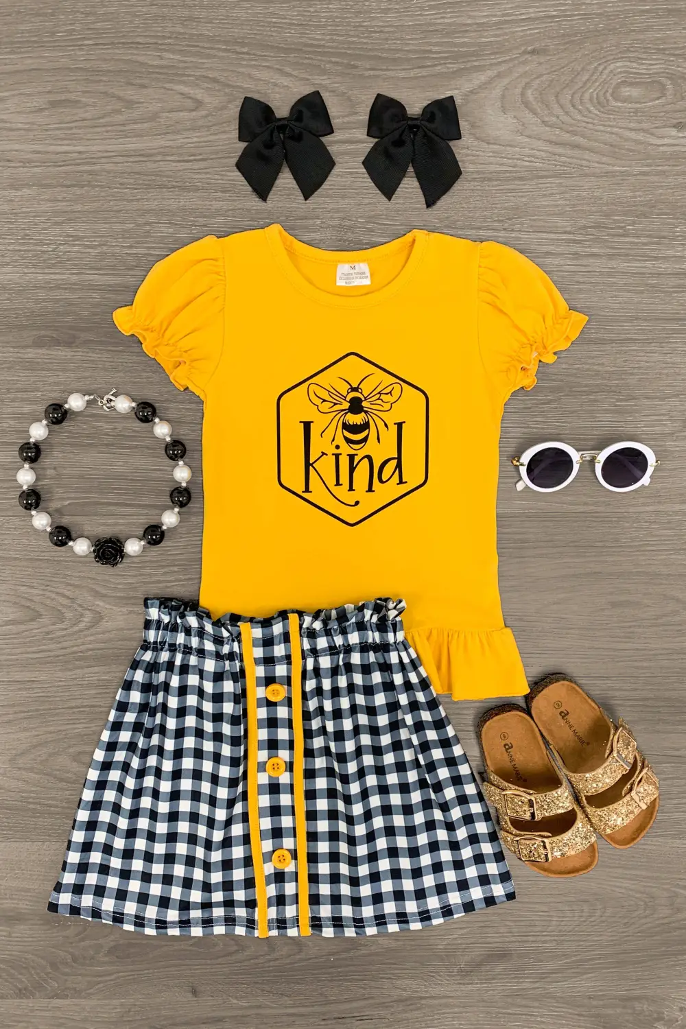 Add sweet fluttery style to her look with this "Bee Kind" Mustard Gingham Skirt Set. This girls' set is styled with a mustard short sleeve top that has sweet feminine cinch sleeves making it a staple addition to her everyday wear. Paired with a gingham skirt that features decorative front buttons adding a playful twist to her look. The breathable fabric makes for cool and comfy wear, while the pull-on style allows for simple dressing. She can pair this dress with or a matching for a cute look!