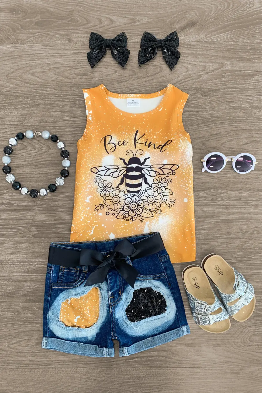 Your little one will look "BEEautiful" in our new "Bee Kind" Sequin Denim Short Set for girls! This mustard yellow tank top features an adorable bee design on the front and is paired with matching distressed denim sequin shorts. The adjustable waistband helps comfort and fit and can be great for on the go. The top and pants can be worn as a set and paired with our SIP or keep it laid back with a pair of , she’ll shine bright in this kids ensemble.