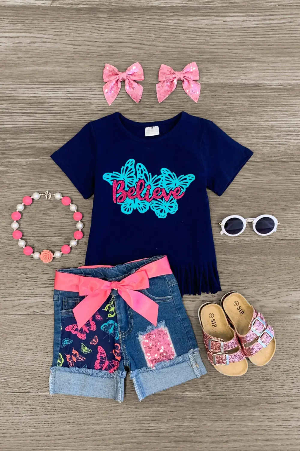 Bring on springtime with this "Believe" Butterfly Distressed Denim Short Set for girls. This fringe hem top looks adorable paired with the matching denim shorts. The adjustable waistband helps comfort and fit and can be great for on the go, while the short sleeve design makes it perfect for warm weather wear. The top and shorts can be worn as a set and paired with our matching or keep it laid back with a pair of , she’ll shine bright in this kids ensemble.