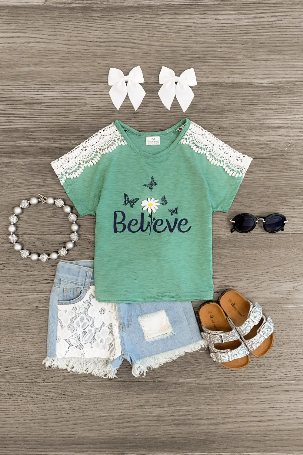 Add sweet fluttery style to her warm weather wardrobe with this "Believe" Butterfly Lace Denim Short Set for girls. This sweet green top features short sleeves with a cute saying on the front. This top looks adorable paired with the matching denim shorts. The stretchy waistband helps comfort and fit and can be great for on the go, while the matching lace details on the top & shorts add the perfect touch. The top and shorts can be worn as a set and paired with our SIP or keep it laid back with a pair of , she’ll shine bright in this kids ensemble.