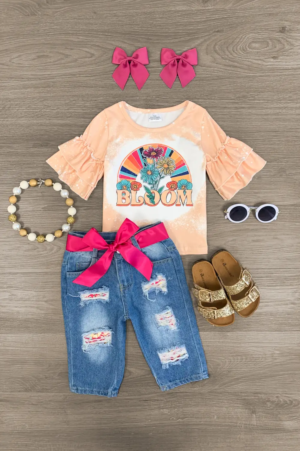 Add sweet summery style to her look with this "Bloom" Tan Ruffle Denim Capri Set. This girls' set is styled with a ruffle sleeve top making it a staple addition to her everyday wear. This adorable top is paired with matching distressed denim capris with peekaboo details adding feminine flair. The adjustable waistband & matching ribbon belt provides a secure fit, and the ultra-soft fabric provides all day comfort. She can pair this set with some or our fun for the perfect look!