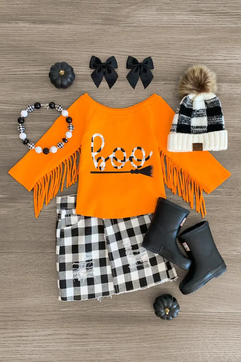 Bring on spooky season with this "Boo" Orange Gingham Denim Skirt Set for girls. This orange top features long sleeves with fringe and a witchy design on the front. The top looks adorable paired with the matching gingham denim skirt. The stretchy waistband helps comfort and fit and can be great for on the go. The top and skirt can be worn as a set and paired with our SIP & a pair of for the perfect Halloween look.