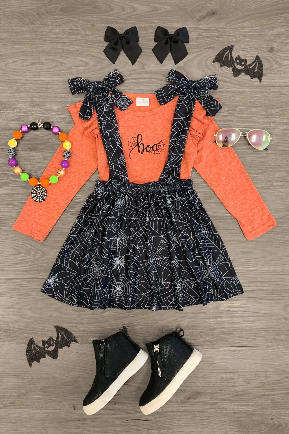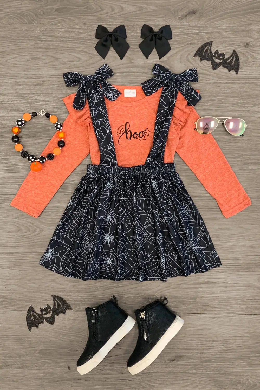 Add sweet fluttery style to her look with this "Boo" Tie Suspender Skirt Set. This girls' set is styled with a simple crewneck long sleeve heather orange top making it a staple addition to her everyday wear. Paired with a black spider web print suspender skirt that features tie details adding a playful twist to her look. The breathable fabric makes for comfy wear, while the pull-on style allows for simple dressing. She can pair this set with or a matching for the perfect look!