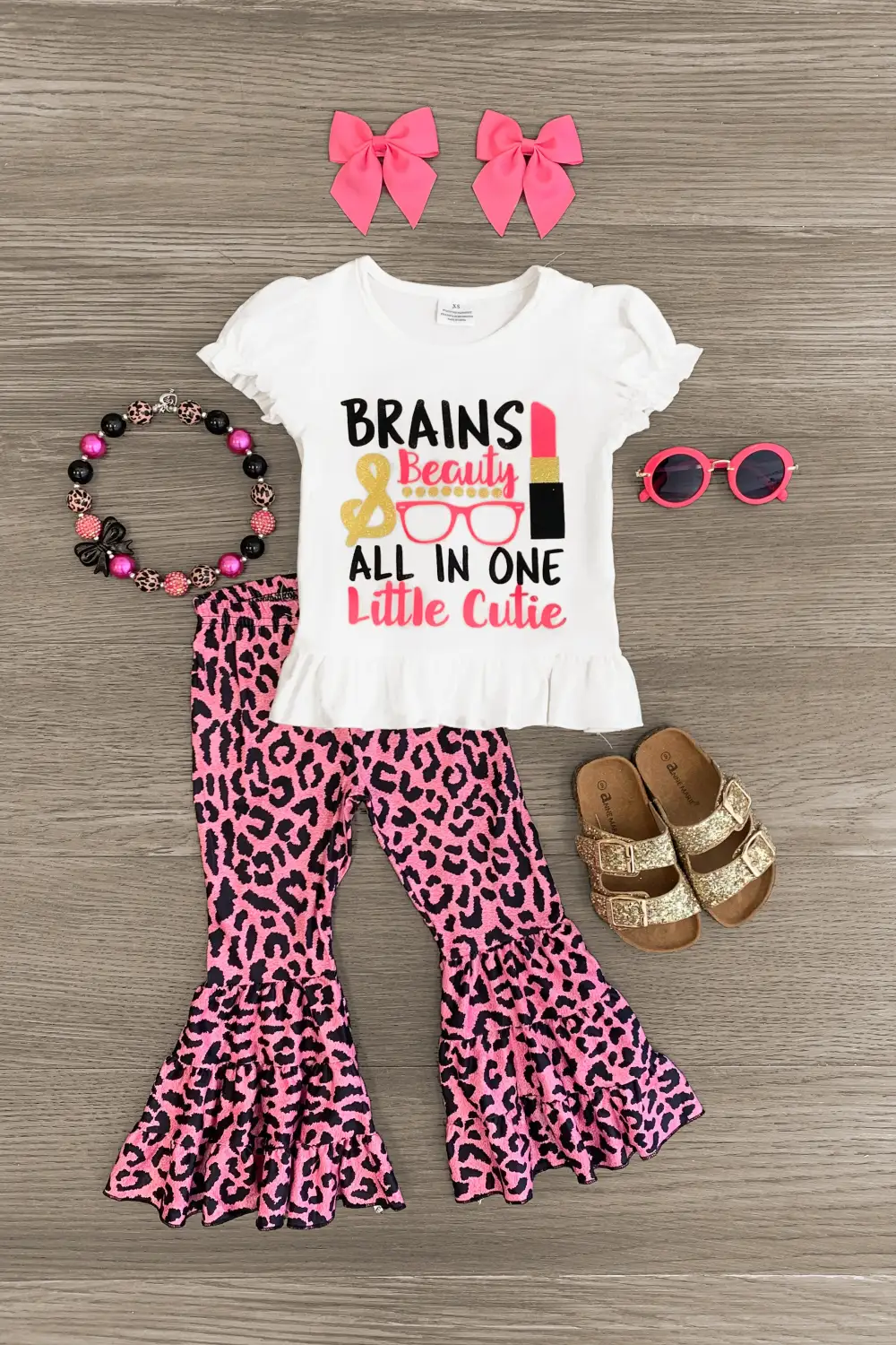 Your little one will look so adorable in this "Brains & Beauty" Pink Cheetah Bell Bottom Set for girls. This sweet ruffle detail top looks adorable paired with the pink cheetah print bell bottoms. The stretchy waistband helps comfort and fit and can be great for on the go. The top and pants can be worn as a set and paired with our matching or keep it laid back with a pair of , she’ll shine bright in this kids ensemble.