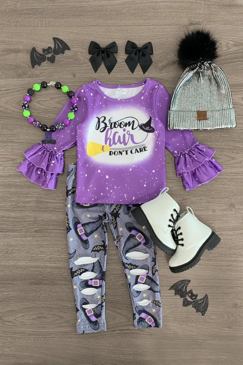 Bring on spooky season with this "Broom Hair Don't Care" Witchy Legging Set for girls. This long sleeve top features a cute witch saying on the front with ruffle sleeves. This top looks adorable paired with the matching leggings. The stretchy waistband helps comfort and fit and can be great for on the go. The top and leggings can be worn as a set and paired with our matching or keep it laid back with a pair of , she’ll shine bright in this kids Halloween ensemble.