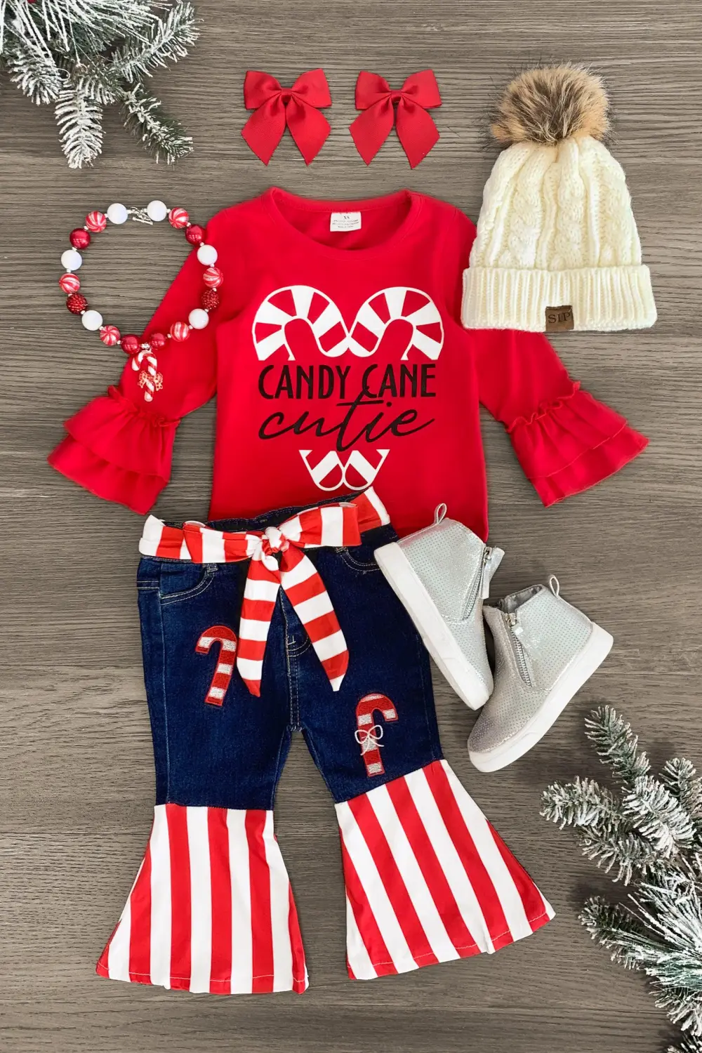 Bring on the holiday season with this "Candy Cane Cutie" Denim Bell Bottom Set for girls. This red top with ruffle sleeves looks adorable paired with the matching denim & striped bell bottom pants. The adjustable waistband helps comfort and fit and can be great for on the go. The top and pants can be worn as a set with the matching striped tie belt, and paired with our SIP or keep it laid back with a pair of , she’ll shine bright this holiday season.