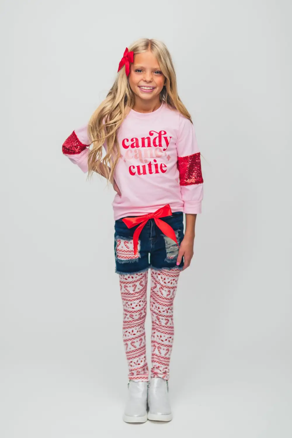 Your little one will look oh-so cute this holiday season in our "Candy Cane Cutie" Legging & Short Set. This girls' set is styled with a pink long sleeve top with red sequin detailing, making it a staple addition to her holiday wear. Paired with distressed denim shorts, matching Nordic candy cane leggings & a ribbon belt to match, the ultra-soft fabric allows her to be comfy all day long. She can pair this set with or a matching for the perfect look!