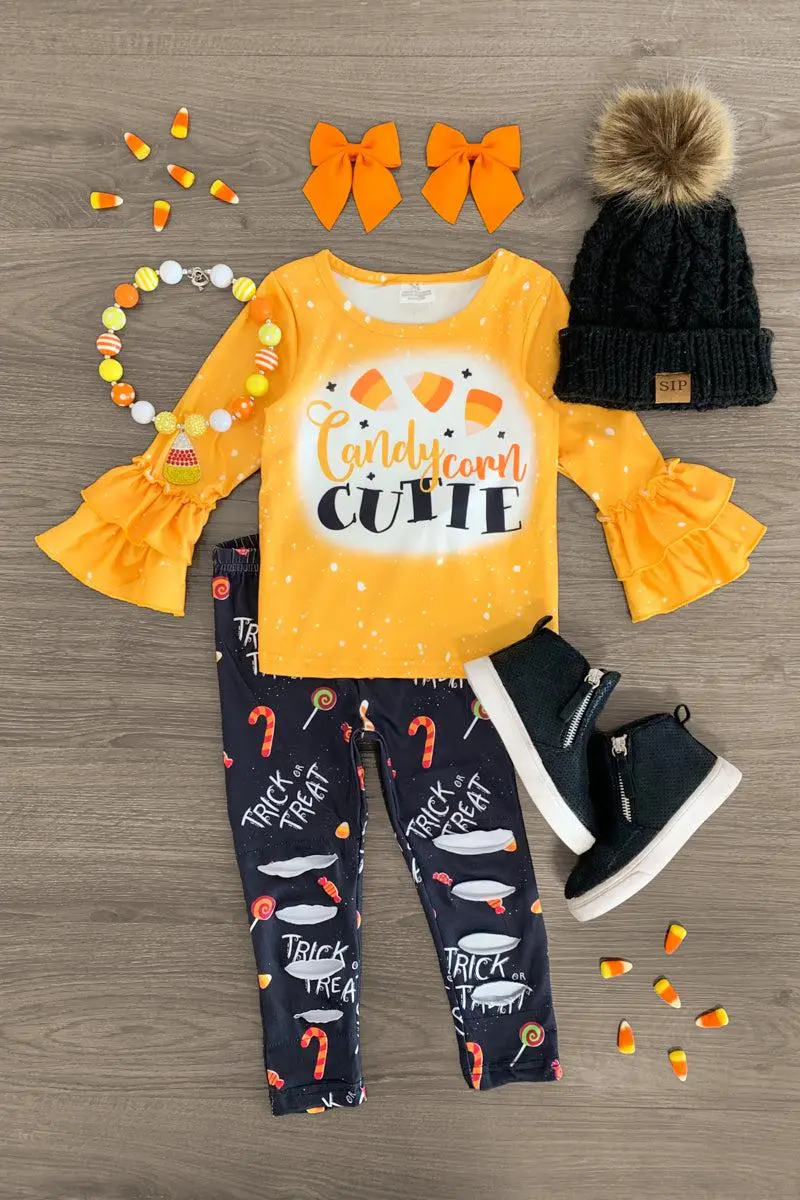- Top features bell sleeves & "Candy Corn Cutie" on the front