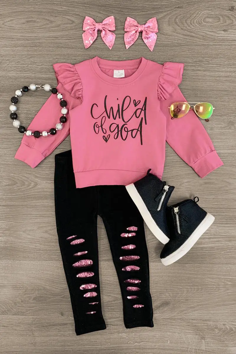 Bring on the autumnal vibes with this "Child Of God" Sequin Distressed Legging Set for girls. This long sleeve top features a cute saying on the front with ruffle detailing on the sleeves. This top looks adorable paired with the matching distressed sequin leggings. The stretchy waistband helps comfort and fit and can be great for on the go. The top and leggings can be worn as a set and paired with our matching or keep it laid back with a pair of , she’ll shine bright in this adorable kids ensemble.