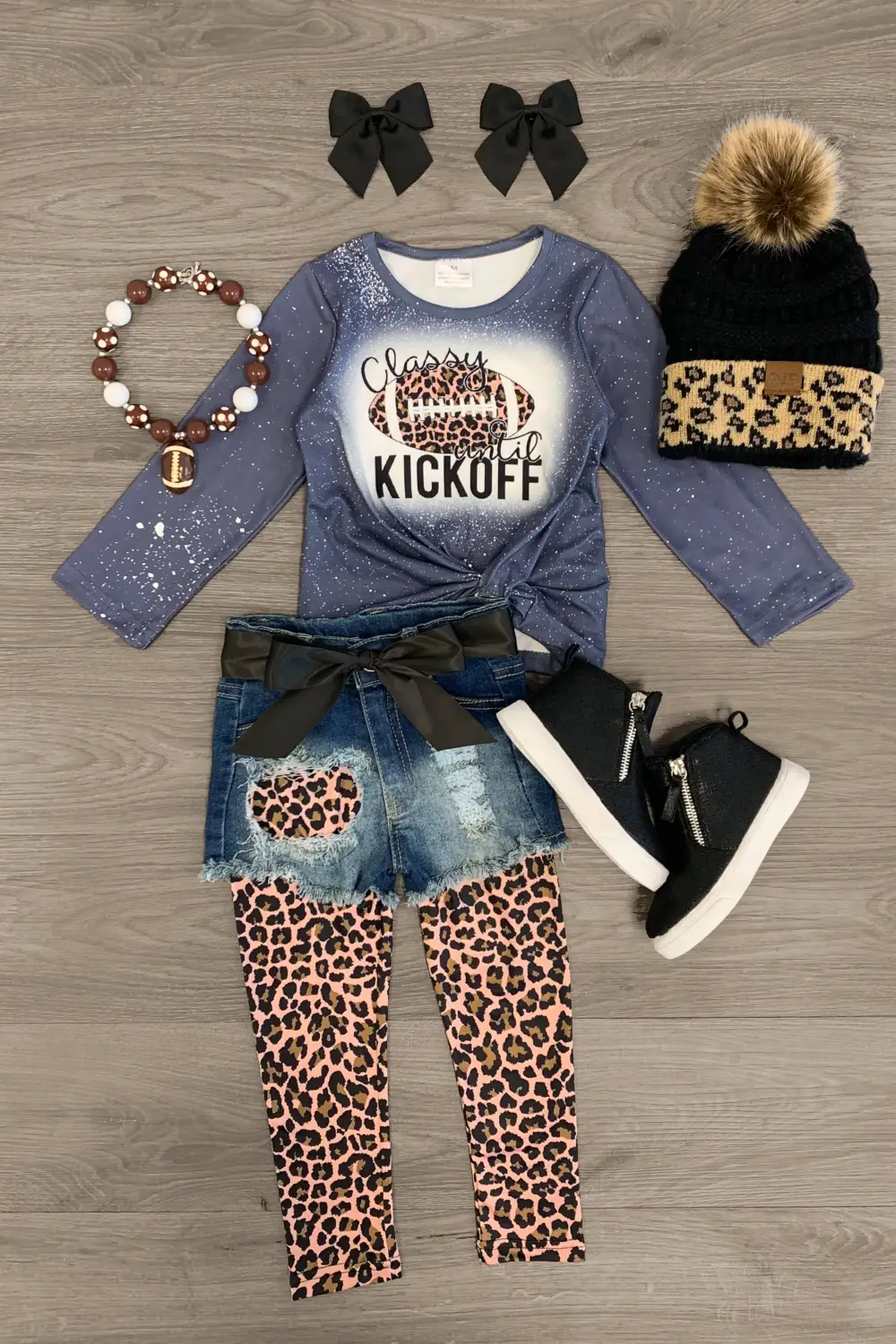 Be the cutest girl around with this "Classy Until Kickoff" Leopard Legging & Short Set. This girls' set is styled with a simple long sleeve top with a cute football design on the front making it a staple addition all season long. This top is paired with matching distressed denim shorts and leopard print leggings to match. The ultra soft fabric makes for comfy all day wear. She can pair this outfit with or a matching for the perfect look!