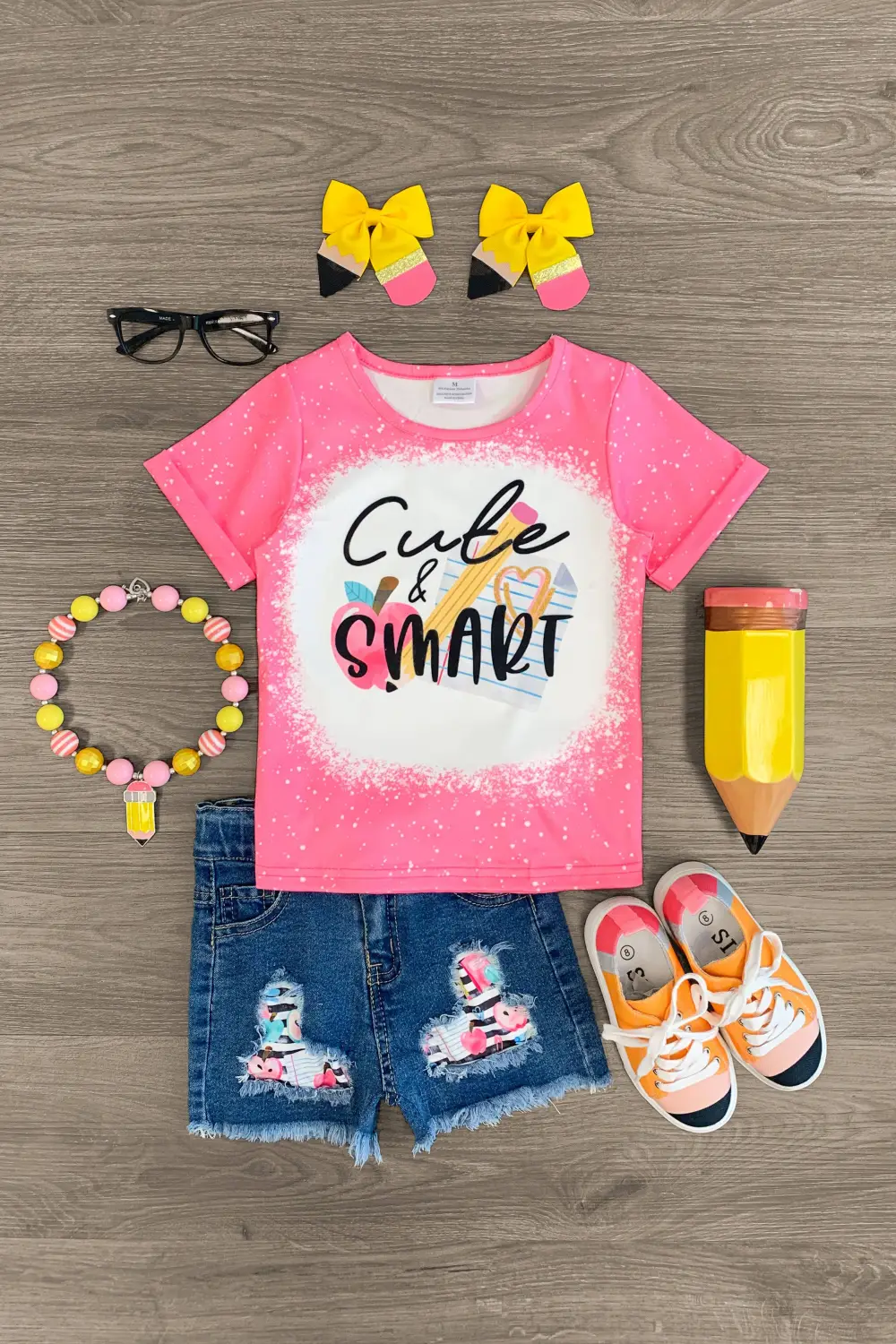 Your sweet little one will look oh-so adorable in our "Cute & Smart" Distressed Denim Short Set for girls. This pink top features a cute saying on the front as well as short sleeves. This top looks adorable paired with the distressed denim shorts. The adjustable waistband helps comfort and fit and can be great for on the go. The top and shorts can be worn as a set and paired with our matching or keep it laid back with our , she’ll shine bright in this kids ensemble.