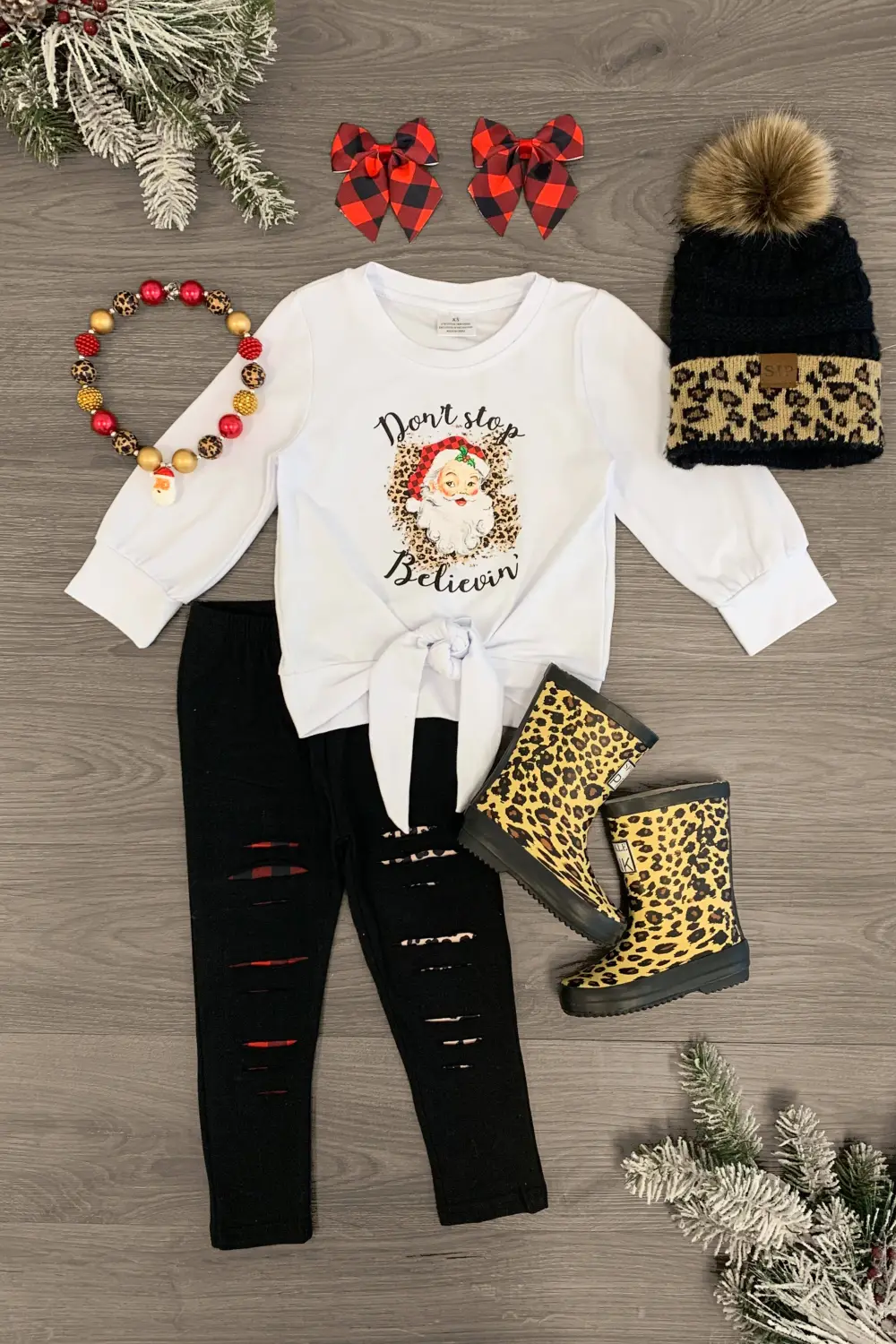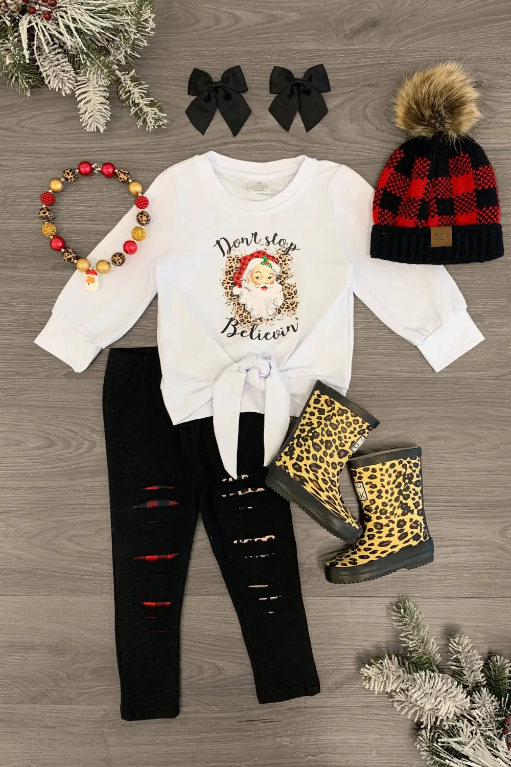Bring on the holiday season with our "Don't Stop Believin" Distressed Legging Set for girls. This tie-waist top looks adorable paired with matching black distressed leggings with peekaboo details. The stretch waistband helps comfort and fit and can be great for on the go, while the long sleeves keep your little one cozy and looking like a dream. The top and bottoms can be worn as a set and paired with our or keep it laid back with a matching , she’ll shine bright this Holiday season.