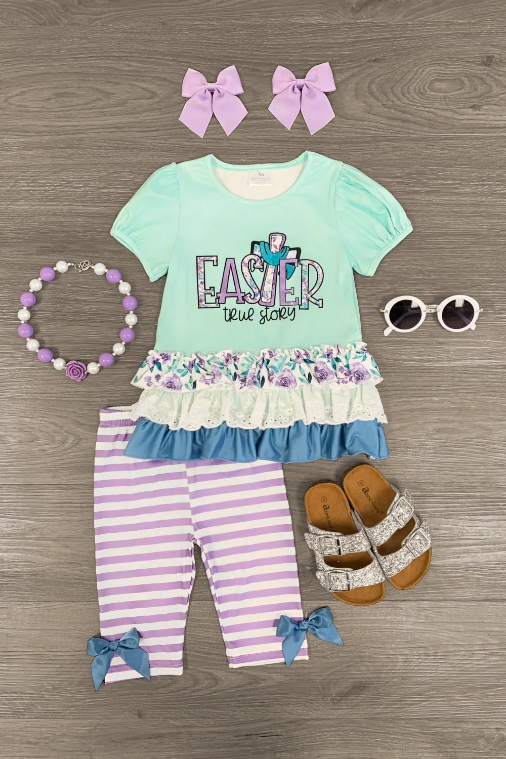- Top features a purple & mint ruffle design with "Easter, True Story" on the front