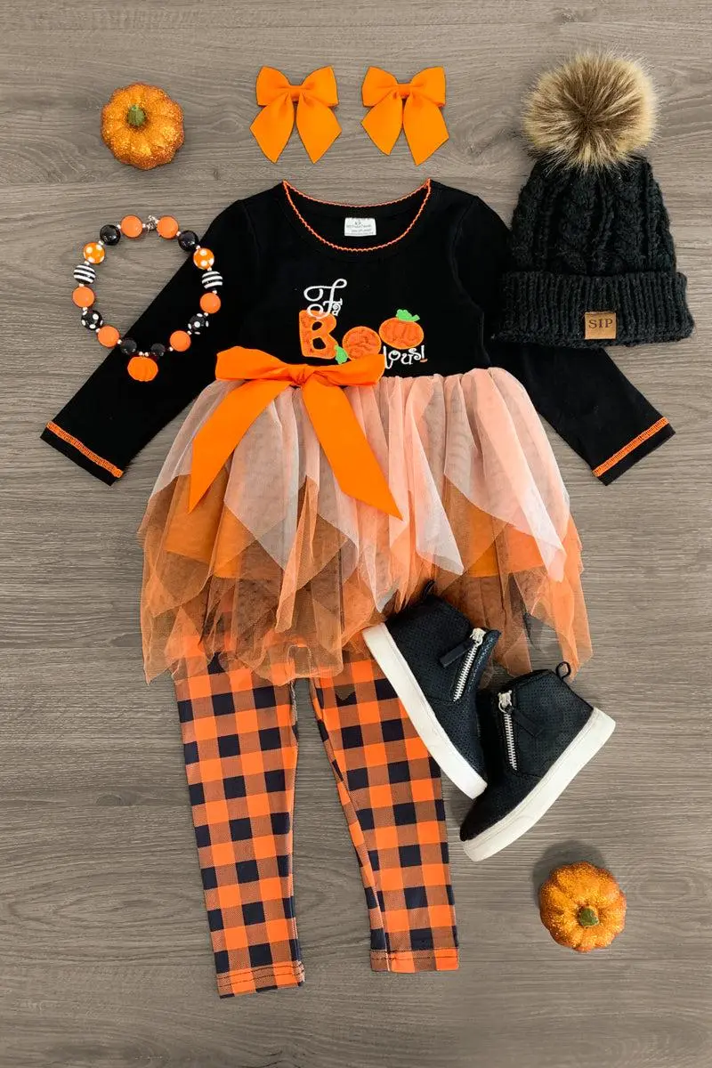 Add sweet & spooky style to her look with this "FaBoolous!" Orange Gingham Tutu Legging Set. This girls' set is styled with a simple crew neckline and long sleeves, making it a staple addition to her Halloween wear. The top features an embroidered saying on the front with a tutu attached with ribbon bow detailing and looks adorable paired with the matching plaid leggings. The stretch waistband helps comfort and fit while the embossed ghosts add a fun and spooky flair. She can pair this set with a matching for the perfect look!