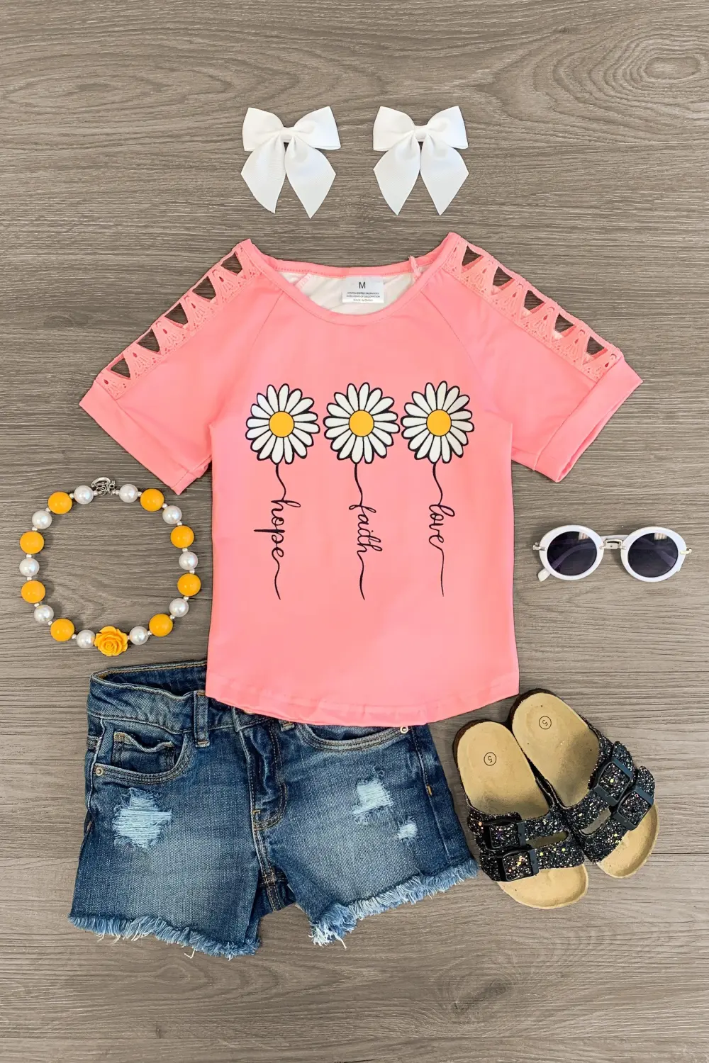 Your little one will look oh-so adorable in our "Faith Hope Love" Pink Daisy Top. In a versatile design, this top is made from soft and cozy fabric that will keep her comfy during all adventures. She can pair it with a variety of SIP & our for an oh-so adorable look. Crafted in a soft cotton spandex blend and perfect for warmer weather, she'll shine bright in this girls' top.