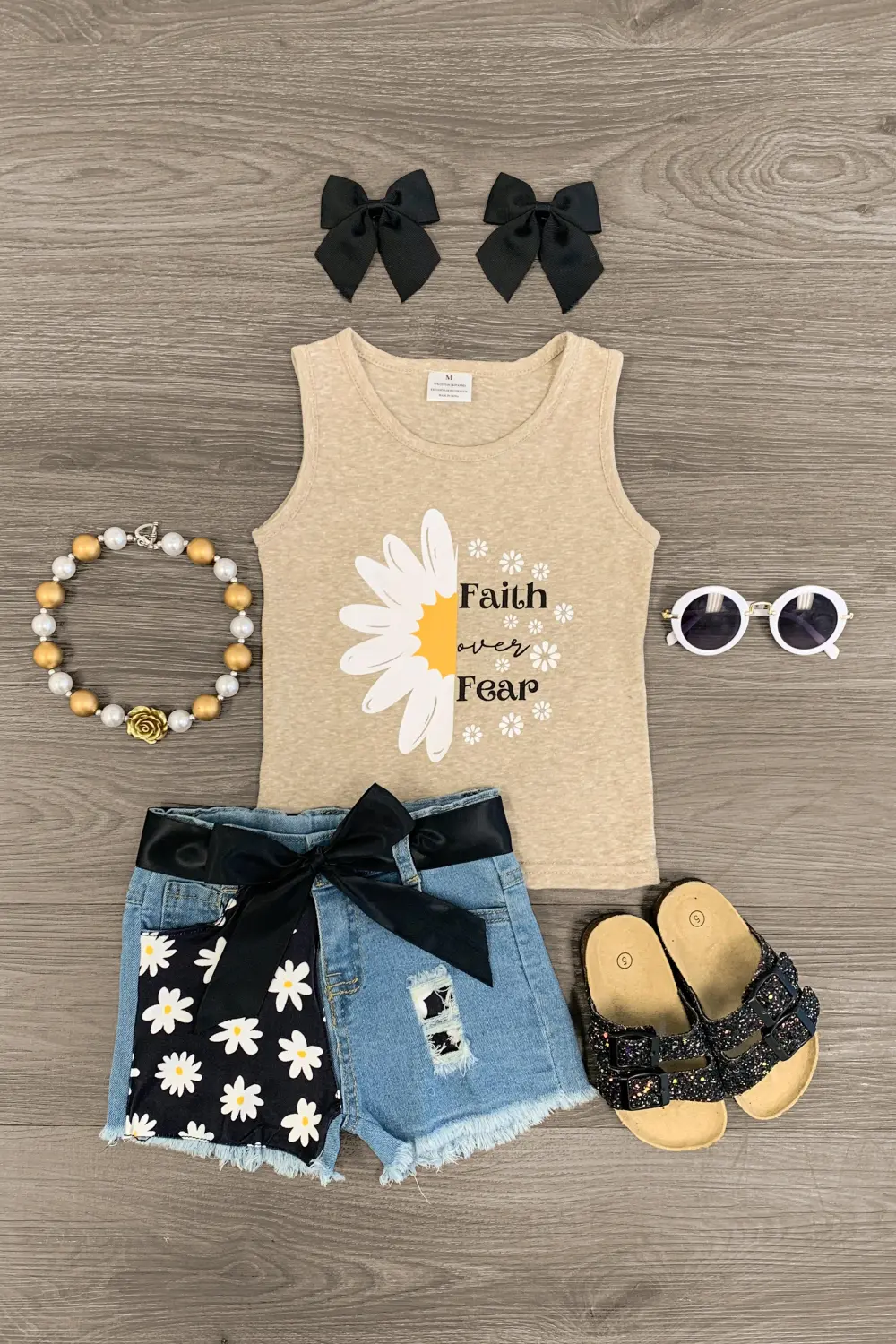 Bring on Spring & Summer with this "Faith Over Fear" Daisy Denim Short Set for girls. This crew neck tank looks adorable paired with the distressed denim shorts. The adjustable waistband helps comfort and fit and can be great for on the go, while the daisy print details add a fun touch. The top and shorts can be worn as a set with the matching ribbon belt and paired with our matching or keep it laid back with a pair of , she’ll shine bright in this kids ensemble.