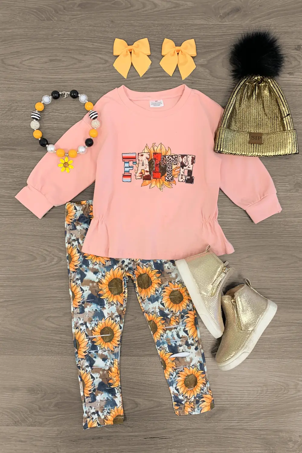 Step out in sweet, sunny style in this "Faith" Blush Sunflower Distressed Legging Set for girls. This long sleeve blush top looks adorable paired with the distressed sunflower leggings. The stretchy waistband helps comfort and fit and can be great for on the go. The top and pants can be worn as a set and paired with our matching , or keep it laid back with a pair of , she’ll shine bright in this kids ensemble.