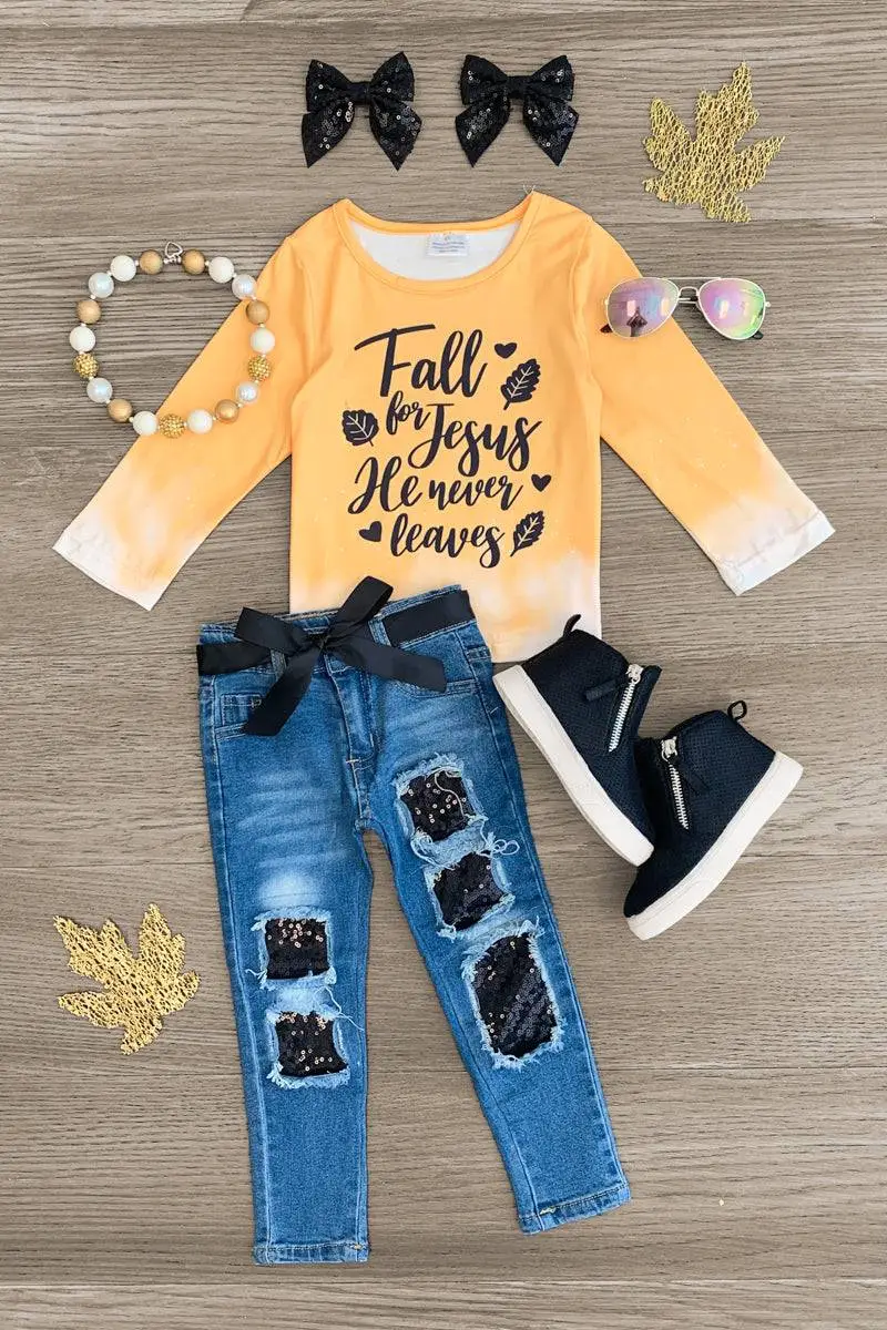 Your little one will shine bright wearing our "Fall For Jesus He Never Leaves" Denim Set for girls. This long sleeve top features a cute saying on the front. The top looks adorable paired with the distressed denim pants. The adjustable waistband & ribbon belt helps comfort and fit and can be great for on the go. The top and pants can be worn as a set and paired with one of our SIP or keep it laid back with a pair of , she’ll shine bright in this kids ensemble.