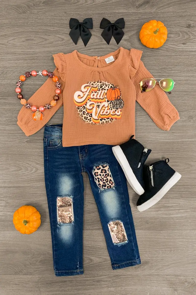 Bring on the cooler days with this "Fall Vibes" Sequin Denim Pant Set for girls. This long sleeve blouse features "Fall Vibes" embossed on the front with ruffle detailing. This top looks adorable paired with the matching distressed denim jeans. The adjustable waistband helps comfort and fit and can be great for on the go. The top and pants can be worn as a set and paired with our SIP or keep it laid back with a cheetah , she’ll shine bright in this kids ensemble.