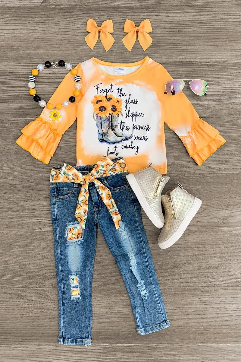 Your little one will shine bright wearing our "Forget The Glass Slipper" Sunflower Denim Set for girls. This long sleeve top features a cute saying on the front, and looks adorable paired with the distressed denim pants. The adjustable waistband & matching tie belt helps comfort and fit and can be great for on the go. The top and pants can be worn as a set and paired with one of our SIP or keep it laid back with a pair of , she’ll shine bright in this kids ensemble.