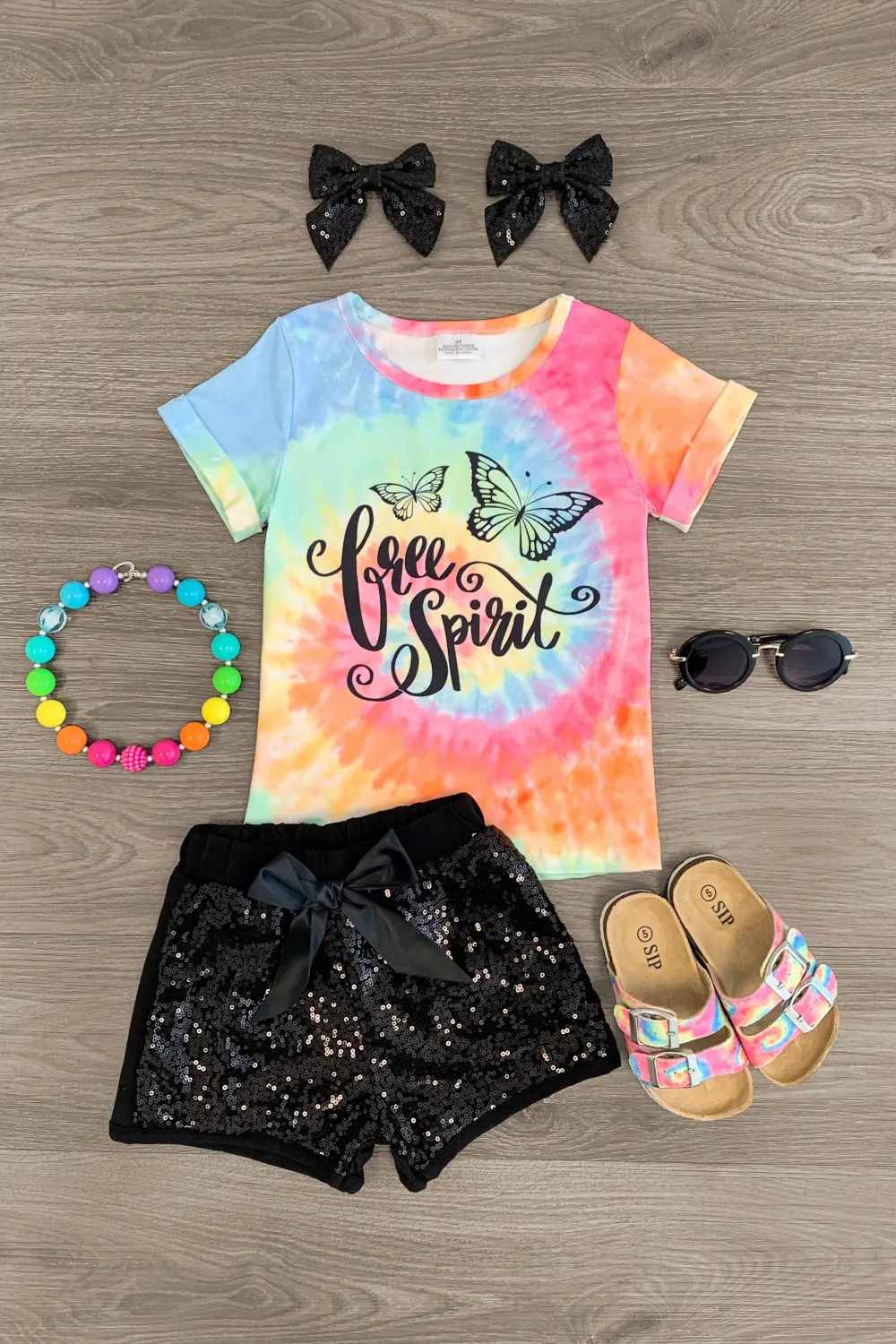 Your sweet little one will love this "Free Spirit" Butterfly Tie Dye Sequin Short Set for girls. This set features a rainbow tie dye top with a cute saying embossed on the front. This top looks adorable paired with the matching sequin shorts. The stretchy waistband helps comfort and fit and can be great for on the go, while the blush pink design adds a fun touch to her look. The top and shorts can be worn as a set and paired with our or keep it laid back with a pair of , she’ll shine bright in this kids ensemble.