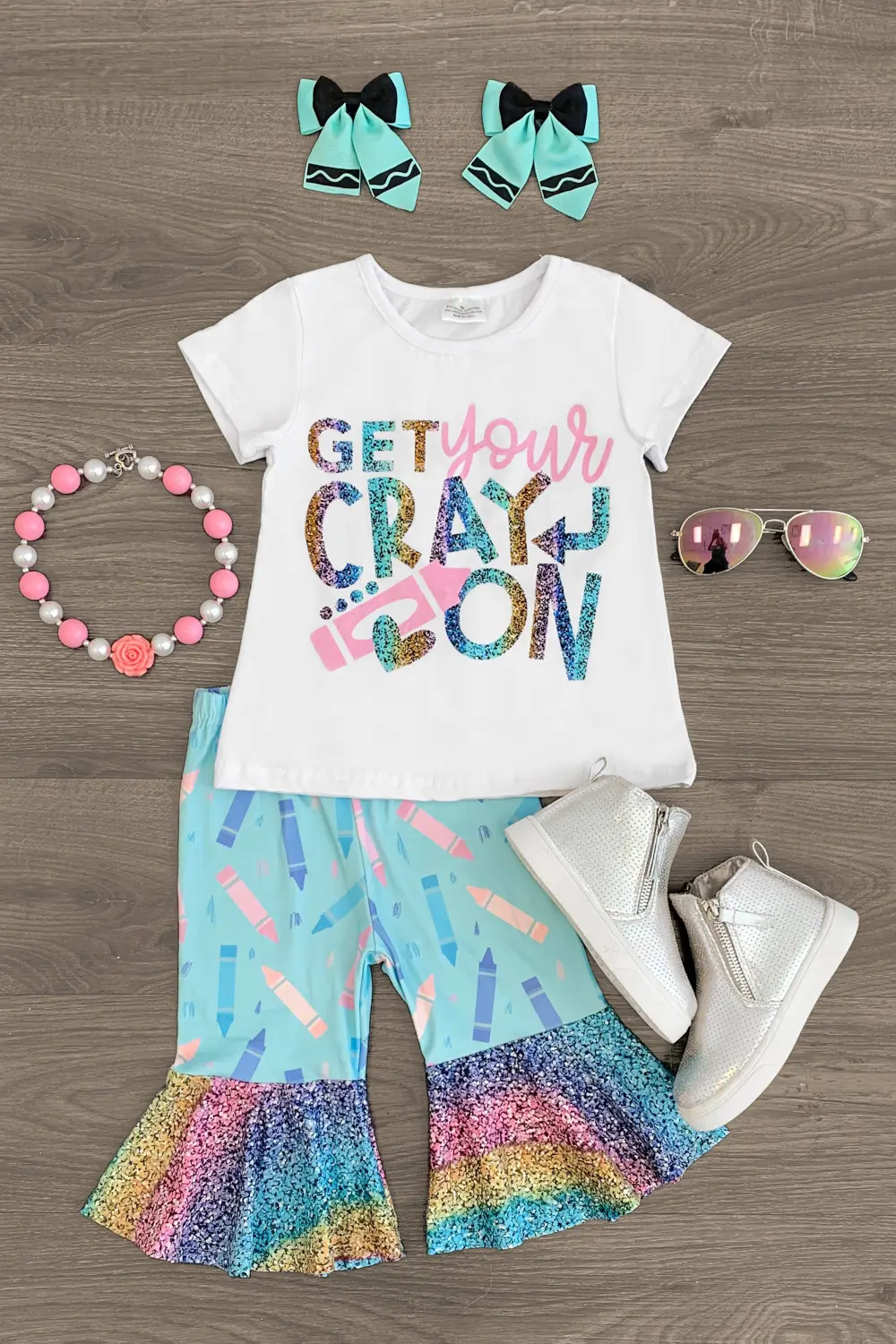 Add sweet fluttery style to her look with this "Get Your Cray On" Bell Bottom Set. This girls' set is styled with a simple short sleeve top making it a staple addition to her everyday wear. The top is paired with matching bell bottoms. The stretchy waistband provides a secure fit. She can pair this set with or our fun for the perfect school look!