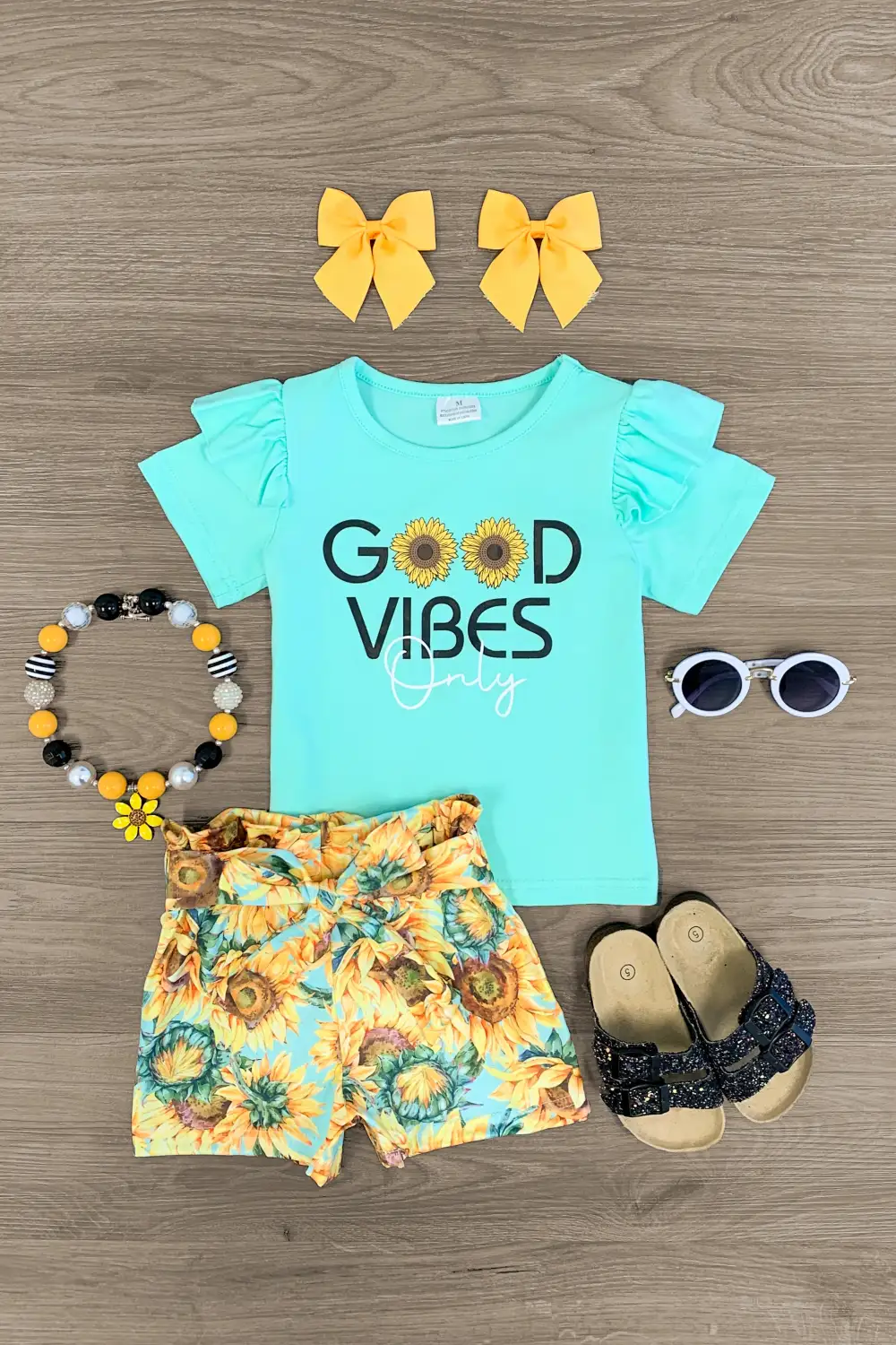 Your little one will look so adorable in our "Good Vibes Only" Mint Sunflower Tie Short Set. This girls' set is styled with a simple short sleeve top making it a staple addition to her everyday wear. The top is paired with matching sunflower print shorts with a stretchy waistband to provide a secure fit. She can pair this set with or a fun SIP for the perfect look!